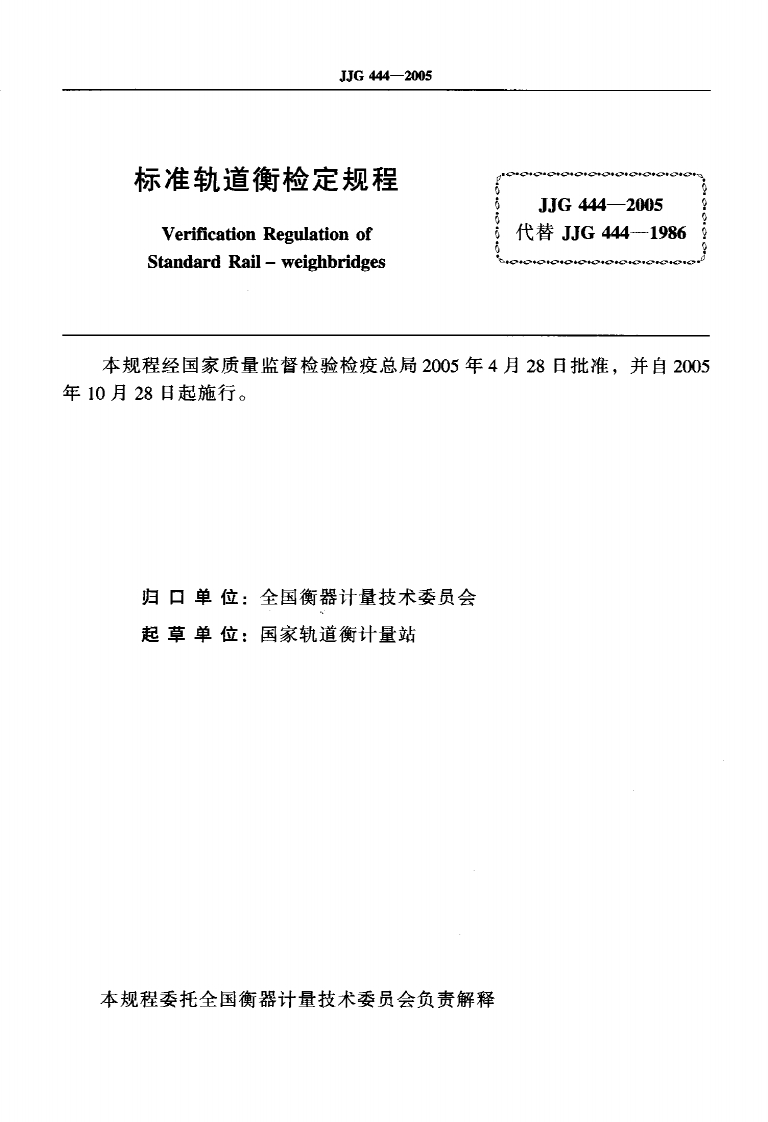 JJG444-2005标准轨道衡348072@abc5个月前发布关注私信0.30MB18页039JJG444-2005标准轨道衡此内容为付费资源,请付费后查看¥17¥22黄金会员免费钻石会员免费立即购买您当前未登录!建议登陆后购买,可保存购买订单付费资源 第1页 / 共18页 第2页 / 共18页 试读已结束,还剩16页,您可下载完整版后进行离线阅读 THE END标准规范 文本预览 可力G中华人民共和国国家计量检定规程JJG444一2005标准轨道衡Standard Rail -weighbridges2005-04-28发布2005-10-28实施国家质量监督检验检疫总局发布 查看更多 收起部分 喜欢就支持一下吧收藏