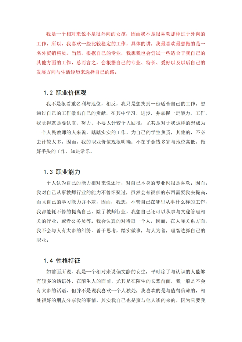 商务英语专业大学生职业生涯规划书卷首语:对于上大学的我来说,面对这样宽松制的生活,显得有些轻松,也有些迷茫。这样的生活让我对自己的未来,对自己的将来也许会走的路充满了无奈与彷徨。职业规划不仅是对职业的规划,更是对人生的规划、对自我的规划,这更有利于自身的发展和创造。在自我职业规划之前,也许你只是一个默默无闻,也许兢兢业业、脚踏实地的工作者,但在认真地规划之后,你就是个主宰者,至少是自己的主宰。人生的进步少不了动力和目标,而这个目标就从规划开始。规划职业,掌握人生。第一部分自我认知分析1.1职业兴趣