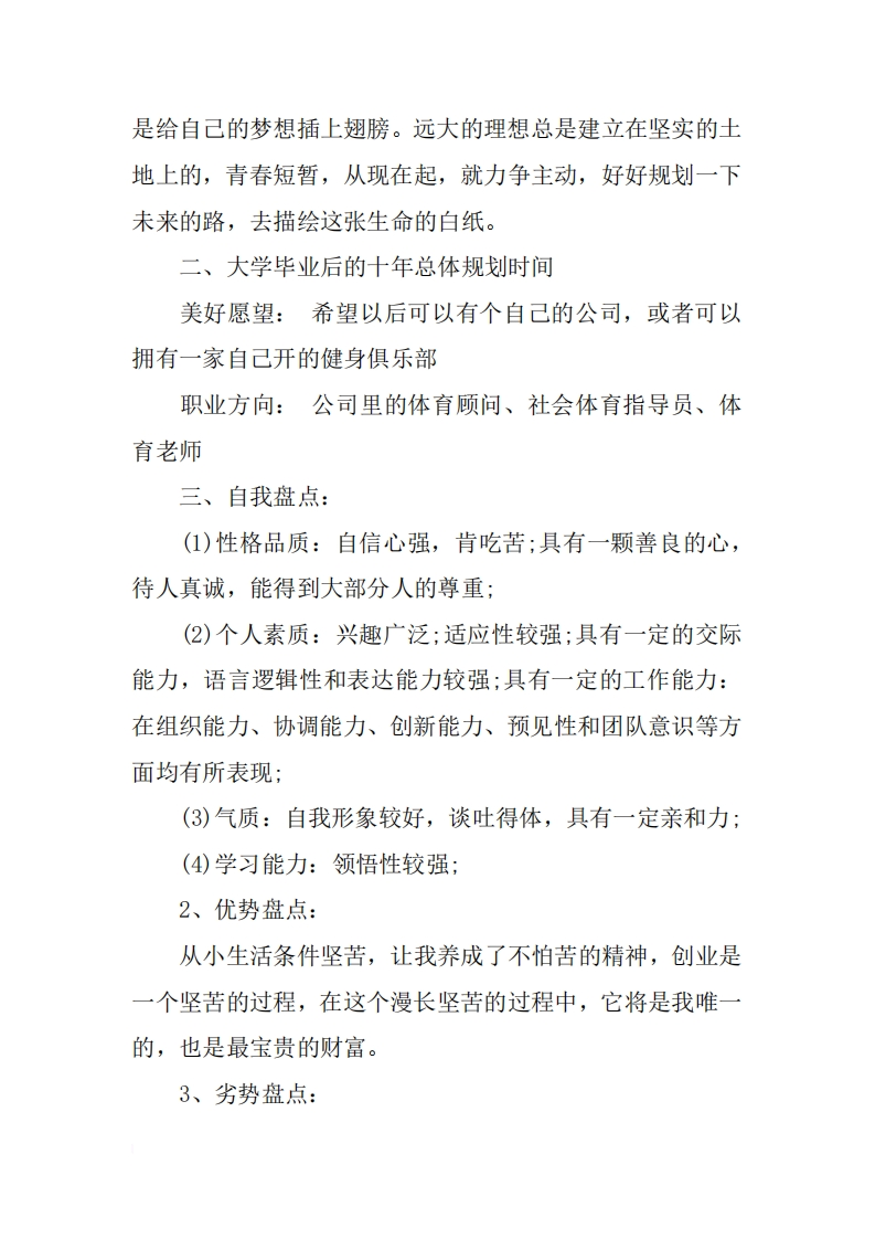 社会体育专业大学生职业生涯规划书我们向往着美好的明天,所以一直为着心中的那个梦而奋斗。大学生职业生涯规划,换个角度理解,就是对我们心中的那个蓝图的描绘。我们对自己的职业生涯进行规划,就是给自己的梦想插上翅膀。远大的理想总是建立在坚实的土地上的,青春短暂,从现在起,就力争主动,好好规划一下未来的路,去描绘这张生命的白纸。一、个人资料姓名:#料性别:男出生年月:1992年1月性格:内外向兼之学历:大学本科一年级专业:社会体育座右铭:自信是成功的第一秘诀二、大学毕业后的十年总体规划时间大学生职业生涯规划书(社会体育专业)前言我们向往着美好的明天,所以一直为着心中的那个梦而奋斗。大学生职业生涯规划,换个角度理解,就是对我们心中的那个蓝图的描绘。我们对自己的职业生涯进行规划,就
