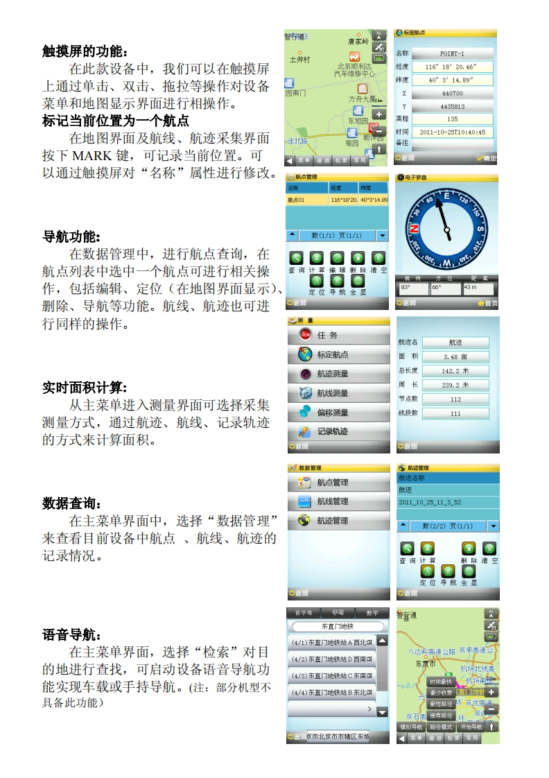 劳伦斯系列手持GPS快速操作向导主功能界面地图界面:主菜单1:主莱单2:智行迎中合功韵合功能唐家岭湖高度计士井村同©卫星信总北京顶过汽车维修中心出电子罗盘关于圆心测量园南门方舟大厕%+O设置东相园②工具注北路菊园。ò已数据管理莱单漫附老紫常用©返回◆下页和上页卫星状态:罗盘界面:高度界面:目卫星信息》电子罗盘合高度剂面图经度116°1g18.25X440649m高程047纬度400316.36V4435859m00.0m精度5m8000m状态DGPS高程109m时间11-10-2为103150581181719425028340172616226.00巾命首西返回首页按键功能Power---电源按键在机身左侧,长按电源按键3秒钟可以打开和关闭设备:点击电源按键可调节屏幕亮度。Mark和方向键-1、在地图界面及航线、航迹采集界面,点击Mark键用来保存您当前的位置做为一个航点。2、点击方向键来移动选择菜单栏,点击Mark键来确认高亮显示菜单对应的功能。放大/缩小按键--在地图界面可以通过此按键放大/缩小地图显示;同时按下放大/缩小按键可对设备进行加锁/解缩。MENU键--在地图界面,点击MENU键可进入主菜MENU单界面。