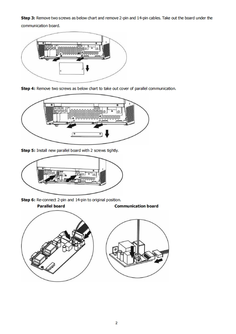 Appendix I:Parallel function1.IntroductionThis inverter can be used in parallel with two different operation modes.1.Parallel operation in single phase with up to 9 units.The supported maximum output powerand for 5KW is 45KW/45KVA.2.Maximum nine units work together to support three-phase equipment.Seven units support one phasemaximum.For 5KW,the supported maximum output power is 45KW/45KVA and one phase can be up to35KW/35KVA.NOTE:If this unit is bundled with share current cable and parallel cable,this inverter is default supportedparallel operation.You may skip section 3.If not,please purchase parallel kit and install this unit by followinginstruction from professional technical personnel in local dealer.2.Package ContentsIn parallel kit,you will find the following items in the package:Parallel boardParallel communication cableCurrent sharing cable3.Parallel board installationStep 1:Remove wire cover by unscrewing all screws.Step 2:Remove communication board by unscrewing two screws as below chart.