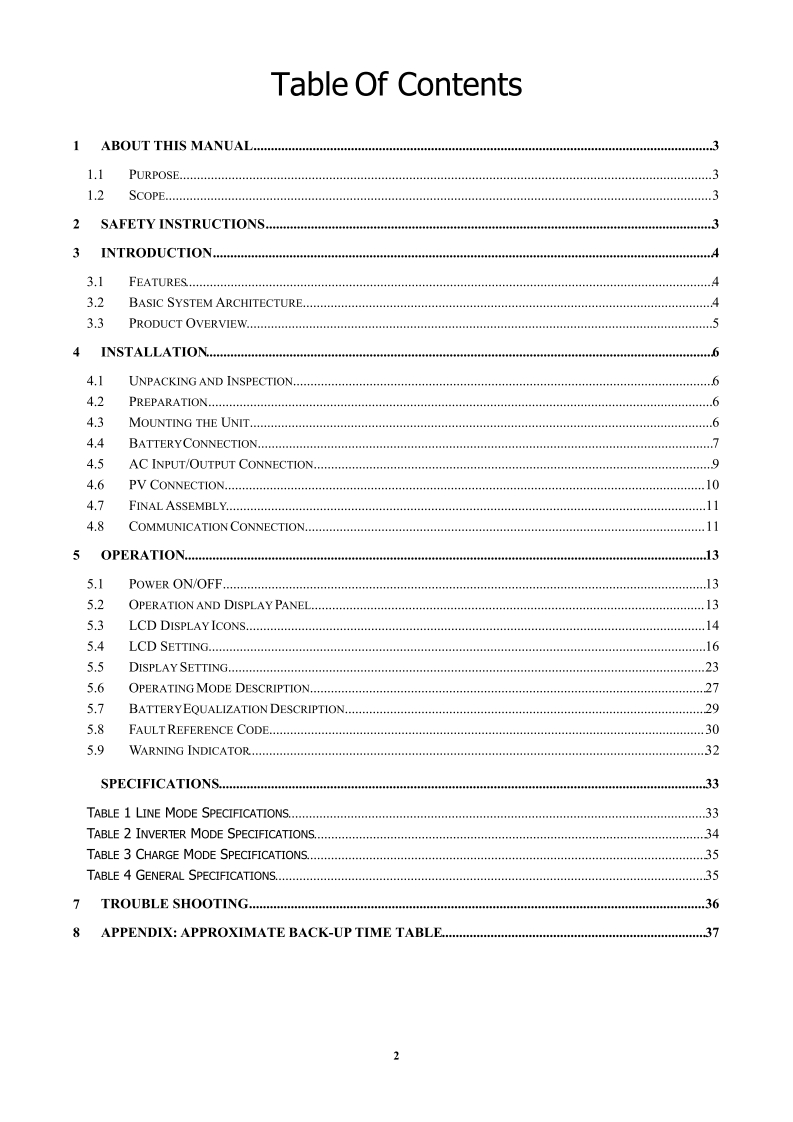 离网逆变器VMIIPlus3.5KW5.5KW操作使用手册348072@abc6个月前发布关注私信13.87MB37页040离网逆变器VMIIPlus3.5KW5.5KW操作使用手册此内容为付费资源,请付费后查看¥16¥23黄金会员免费钻石会员免费立即购买您当前未登录!建议登陆后购买,可保存购买订单付费资源 第1页 / 共37页 第2页 / 共37页 试读已结束,还剩35页,您可下载完整版后进行离线阅读 THE END说明书手册 文本预览 USER MANUAL3.5KW/5.5KW PLUSINVERTER/MPPT SCC/AC CHARGERVERSION:1.01 查看更多 收起部分 喜欢就支持一下吧收藏