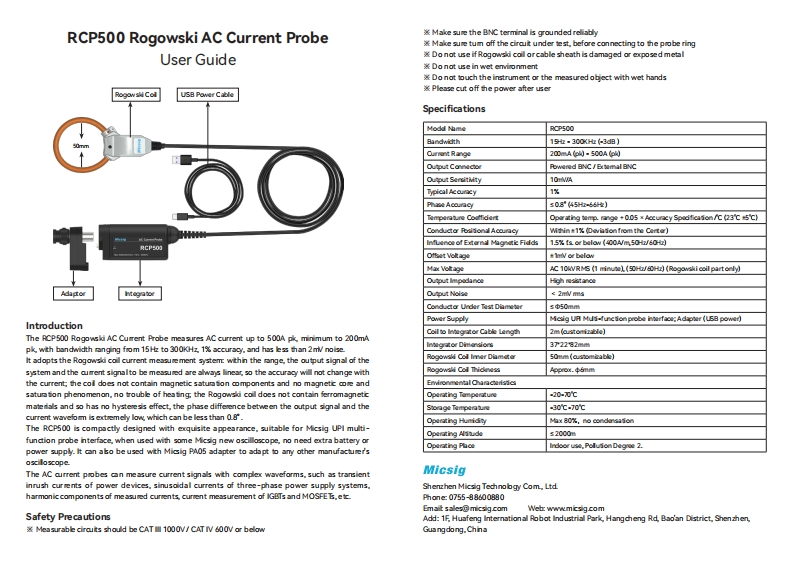 RCP500柔性交流电流探头激罗氏线圈我线缆外皮有破损戒全黑露出时请新使用激请物在有涩的环境中使用用户手册激请新使用涩手接触仪器我者被测物居激使用后请务必切断电源激请在终墙允许的范国内使用本产品多氏线图B供电线提格参数号5S00带夜15300H2(-3dB0渊量也国200ak-500ek输出出接墨可倒电C/外核C输出嫩度10T/A典裂植度1%位植度名0.8”(526E2)温度系夏使用温度范图内加上0.55×精度规格/℃(23C士5C以外)导体位置的影响土1以内《年中心都分的编差)外溶场的影响1.5NE.以下400Wa,32/2)RCPSO的偏置电包压士17以下压C10灯蓝(1分钟】,6020,(仅罗氏线图都异)输出抗斋阻输出噪音<276转楼头积丹器可测量导体直径6中50m纯e厦PI多功能保头核口供电:转核口:空供电线长(彩份到罗氏线图)2米(可克制)产品介绍份盗R寸372262mP500柔性交流电流探头。其常宽为15300狐业,其最大测量电流为500pk,最小测量罗民图内直径50国(可克制》电流为200成,测量精度可达1墨。嗓声低于2,罗民图面直径约◆6田该型号采用罗氏线圈电流测量系统。在量程范假内。系统的输出信号与待测电流信号一利境直是线性的,使得其精度不会随电流大小而发生变化:线圈不含能地和元件。无能芯地和现象,使用温度-0-70℃爱有发热的烦恼:由于罗氏线圈不含铁能性材料。无能滞救应,系统的输出信号与被测电流储存温度-30℃-70℃波形相位差板低。可小于Q8”:在整体授计上体积小巧,外观精致。道配Miesig UPI多功使用湿度最大8属,无凝结能探头接口,与sg聚新示波器配套使用时,无需考虑供电问题。像普通无源探针一样即使用高度海城斋度62000插即用,也可搭配©sg专用转接头P以5。与任何厂家的示波器道配使用,使用场项室内使用,污染度2交流电流探头可测量波形复杂的电流信号,如功率器件的瞬态冲击电流,三相供电系统的正盘电流,测量电流的请波构成,G图T,江管电流测量等,Micsig安全注意事项深圳麦科信科技有限公司藏可测量电路应力CaT1IⅡ1000m/C以TIW600Y我以下电话:0755-88600880激确保C墙子可靠接地邮箱:salesdnicsig.com网址:www.micsig cam.cn激被测电路接入探头环之前。确保先关闲被测电露地址:深圳市宝安区西乡街道南昌社区杭城大道华来国际机器人产业园A栋一楼