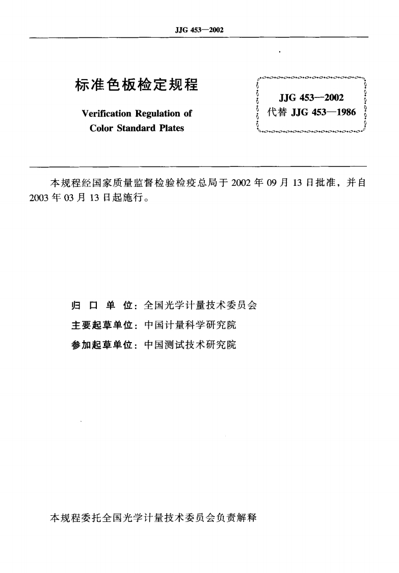JJG453-2002标准色板348072@abc5个月前发布关注私信0.72MB29页036JJG453-2002标准色板此内容为付费资源,请付费后查看¥17¥22黄金会员免费钻石会员免费立即购买您当前未登录!建议登陆后购买,可保存购买订单付费资源 第1页 / 共29页 第2页 / 共29页 试读已结束,还剩27页,您可下载完整版后进行离线阅读 THE END标准规范 文本预览 可可G中华人民共和国国家计量检定规程JJG453-2002标准色板Color Standard Plates2002-09-13发布2003-03-13实施国家质量监督检验检疫总局发布 查看更多 收起部分 喜欢就支持一下吧收藏