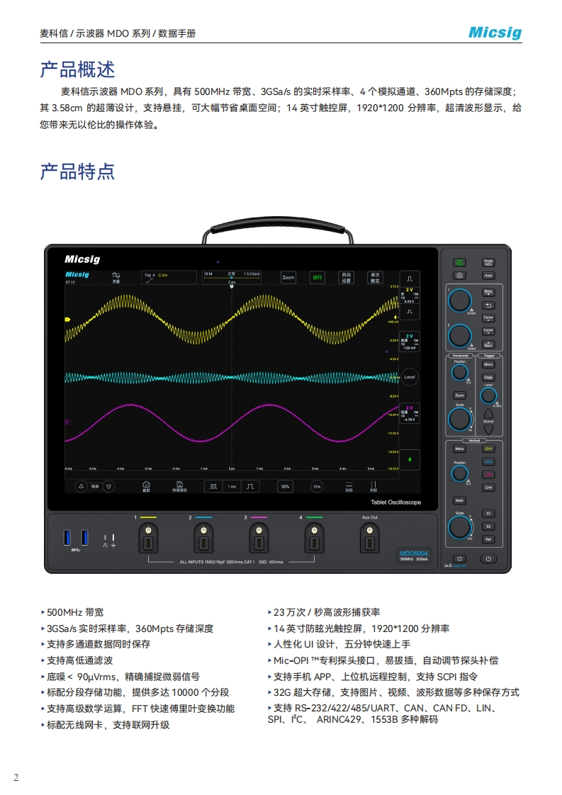 Micsig|麦科信平板示波器开创者光隔离探头创新者平板示波器MDO系列500MHz带宽、4通道3GSa/s采样率360Mpts存储深度14英寸触控屏、1920*1200分辨率Micsiges11:08888▣深圳麦科信科技有限公司全国统一热线电话TEL0755-88600880Shenzhen Micsig Technology Co.,Ltd.www.micsig.com.cn麦科信科技官网