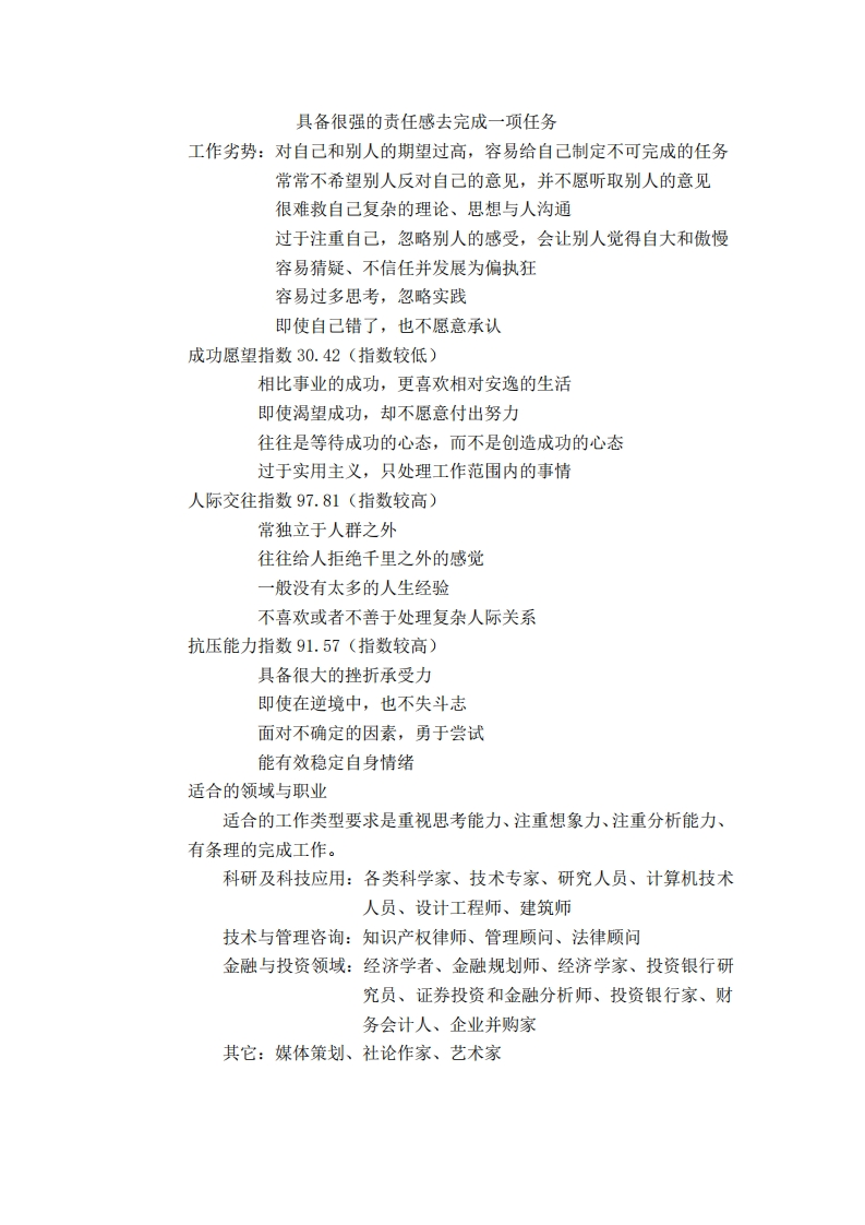 一、自我认识在这个人才竞争日趋激烈的时代,职业生涯规划成为了就业争夺的一个重要的利器。对于每一个人而言,职业生命是有限的,如果不进行有效的规划,势必会造成时间和精力的浪费。作为当代的大学生,若是毫无准备,一脸茫然的进入这个竞争激烈的社会,是很难占有自己的一席之地的。因此,在听完职业生涯规划课后,我有所感悟,为自己制定了自己的一份职业生涯规划。所谓“知己知彼,百战不殆”,在认清自己的现状的基础上,认真规划一下自己的职业生涯,是十分有必要的。这样,有目标才会有方向。一个有效的职业生涯设计必须是在充分且正确认识自身条件和现实社会环境的基础上进行的。所以,要客观地审视自己,认识自己,了解自己。做好自我评估,包括很多方面,比如自己的兴趣,特长,性格,学历,技能,智商,情商,思维方式等。用通俗的语言讲就是,我想干什么,我能干什么,我应该干什么,这样,在众多的职业面前,就知道自己会选择什么了。所以,首要问题是正确评价自己。性格评估BTI测试(天际网职业测评)性格类型:自己属于INTJ型(内向+直觉+思维+判断)是独立思考类型,典型特点是智慧和清晰的概念特点:性格内向,有丰富的内心世界,注重事物的各种可能性,并将这些可能性综合分析、概念化,最终转化成客观的决策,并让这些决策有条理和有计划的实施,并不断自我肯定。其中:驱动力的来源:内向66%接受信息的方式:直觉60%决策的方式:思维93%对待不确定性的态度:判断60%工作优势:拥有独创性的思想,并坚定的促使思想转化为目标对自己要求严格,追求个人能力的最大化用于独立的个性,很少受外界的干扰善于理解复杂和综合的概念与思想能充分发现局势的优缺点,完成重要复杂的任务有足够的能力和积极性去完成自己的目标思维严谨,具备坚忍不拔的素质,善于制定长期的远景规划