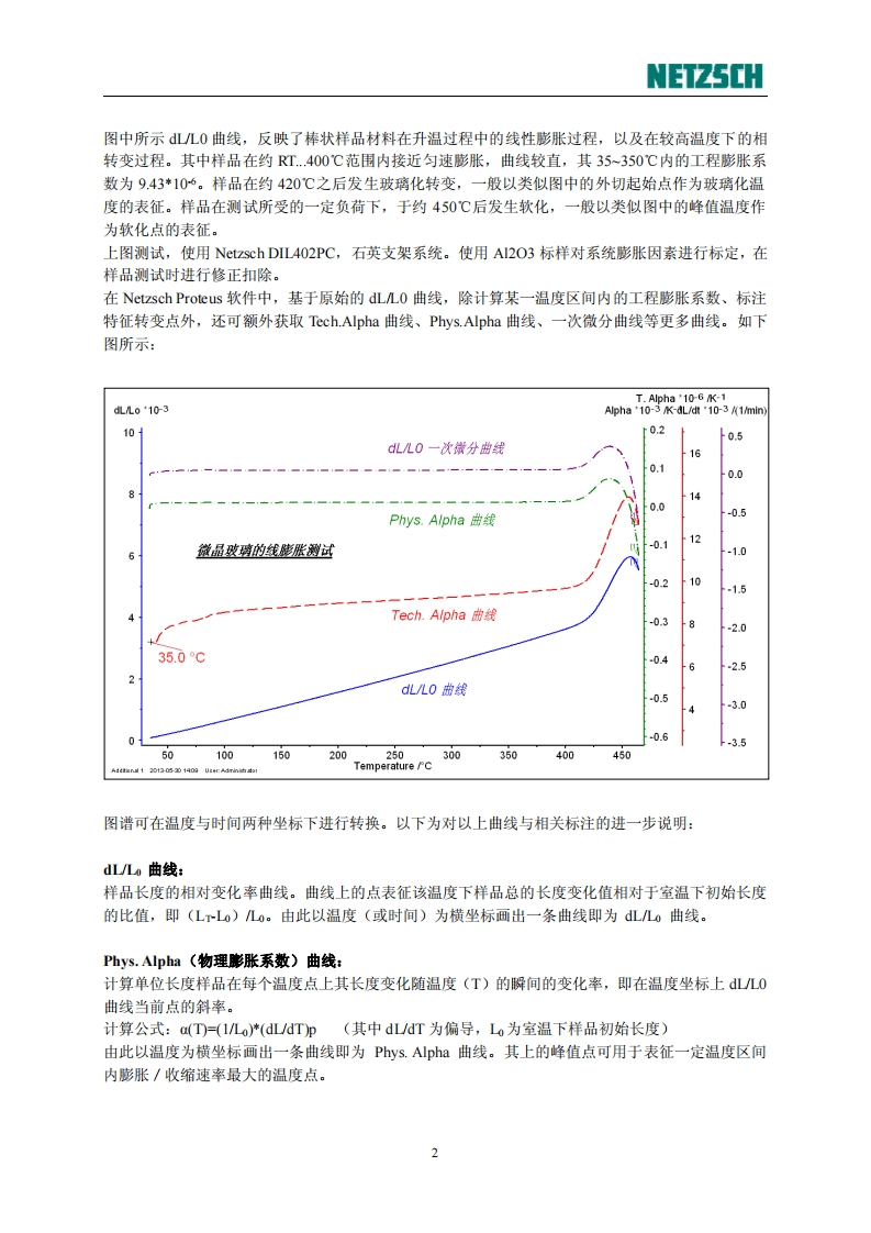 NETZSCH热膨胀仪(DL)基本原理文件编号:cPH60-DL-01热膨胀法(Dilatometry,简称DL)为使样品处在一定的温度程序(升/降/恒温及其组合)控制下,在负载力可忽略不计的情况下测量样品在测试方向上的长度随温度或时间的变化过程。该技术广泛应用于陶瓷材料、金属材料、塑胶聚合物、建筑材料、耐火材料、复合材料等领域。利用热膨胀仪,可以测量材料的线膨胀与收缩、玻璃化转变温度、软化点温度、相变温度,研究烧结过程,优化烧结工艺,作反应动力学研究等。推杆式热膨胀仪的基本结构如下图所示:FumaceLVDTsyste m●●●Push ro dSa m pleLVDT为位移传感器,其上连有推杆,通过与样品的接触获取样品长度的变化信号。其中推杆对样品的作用力很小,原则上对样品无影响,可忽略。样品则处于可控温的炉体中。在程序温度(线性升温、降温、恒温及其组合等)过程中,使用LVDT连续测量样品的长度变化(支架与推杆系统长度变化所引起的系统误差通过事前的标样测试进行计算扣除),即可获得如下类型的图谱:dLU儿0*10-371〔款化点)峰值:457.1℃6微品玻璃的线膨胀测试测试仪器:DL402PC(玻璃化转变)样品长度:24.90mm起始点:421.9℃升温速率:5Kmin(线性膨胀)支架系统:石英4校正标样:A1203,25.00mm温度.心T.a/(1K)35.0.350.0:9.4295E-063250100150200250300350400450温度/℃