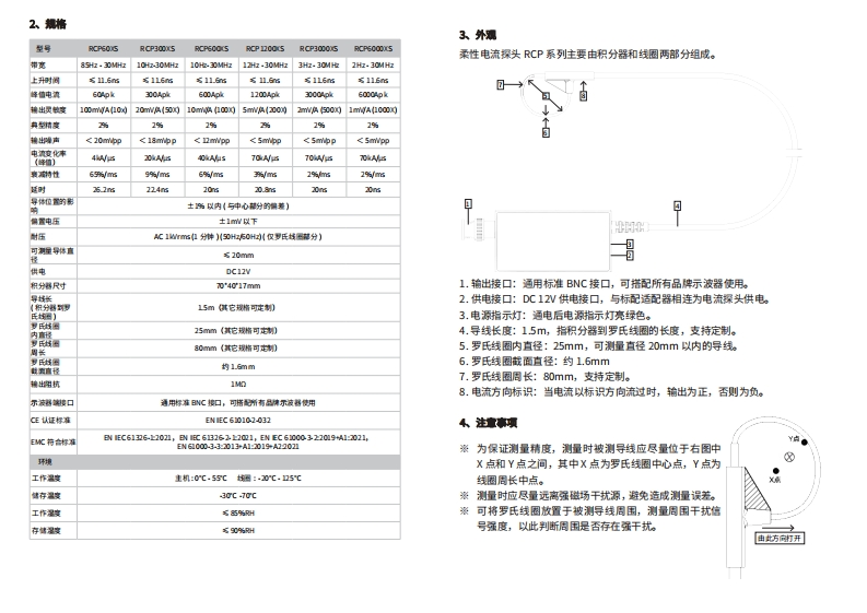 5、绿作步潭McsG麦科信平板示波器开创者光隔离探头引领者1)罐与设■示波■:将示波器输入阻抗设为1MQ,电流探头BNC接口与示波器通道输入相连(注意请确认示波器接地正常);快速操作指南2)绿头供德:使用标配适配器给电流探头供电,通电后电源指示灯亮绿色;柔性电流探头RCP系列3)连撞被时拿:将电流探头连接至被测对像开始测量,请确保线圈插头已插到位,且被测导线或引脚从线圈合适位置穿过。1述4)始被时律上电。5)测试轴桌后请先开电路再拔下■。麦科信(Mic5ig柔性电流禄头(仅称罗氏线团RCP系列具有高达3OMH也的带宽,5)开操头电最大可测电流达6000Apk,探头的耐压值高达1kWm5,插入阻抗几乎为零,最大幅度降任被测对象的干扰。1.6mm超小线圈战面直径,能够轻松穿过T0-220半导体6产品保集器件的管具典型精度高达2%,精确测量高频大电流信号。非常适用于第三代半导1)本罗氏线圈主体保修1年。在产品保修期内,凡属于正常使用情况下,由体双脉冲动态测试,监测半导体开关电流波形等。于产品本身质量问题引起的故障,未经拆修,本公可司将负责给予免费维修。)以下情况保修失效,但提供维修服务,免收人工费,只收取配件费:采用标准BNC接口设计,适配所有品牌示波器,线圈设计轻巧且柔韧,便于插拔,解à.消费者因使用、维护、保管不当造成任何配件的损坏。决硬质探头难以触及的区域问题,轻松实现与被测对象的连接,同时探头线圈直径可b.由不可抗力因素所引致的损坏,如天灾等。根据客户需要定制,满足多种特殊场合测试需求。3引在下列情况,本公司将拒绝提供维修服务或提供收费维修服务:à.无法提供产品包装或产品包装上的防伪标签。b.防伪标盗内容经涂改,或模糊不清而无法辨认。℃.由任何未经麦科信公司授权人士拆动过的(如:换线,拆卸内部元器件等)。d.无销售凭证或销售凭证内容与产品不符。7、安全项※请在安全电压范围内使用。※与探头连接的设备必须保证其可接地。※使用前应检查罗氏线圈外皮,若出现破损应停止使用(⊙@8※被测电路接入探头之前,请确保被测电路处于关闭状态。※请使用本探头标配的适配器进行供电M℃S引G深圳麦科信科技有限公司电话:0755.8g300880邮箱:5as@micg-如m网址:www.micsig.o0mm地址:广东省深圳市宝安区西乡街道铁仔路药号金环字大夏6楼