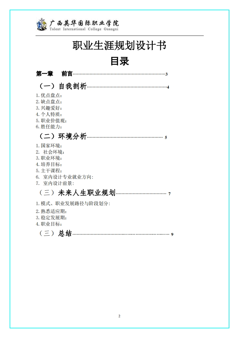 室内设计专业职业生涯规划[1]1348072@abc4个月前发布关注私信0.24MB9页045室内设计专业职业生涯规划[1]1此内容为付费资源,请付费后查看¥13¥22黄金会员免费钻石会员免费立即购买您当前未登录!建议登陆后购买,可保存购买订单付费资源 第1页 / 共9页 第2页 / 共9页 试读已结束,还剩7页,您可下载完整版后进行离线阅读 THE END规章制度 文本预览 广西英华国际职业学院Talent International College Guangxi必业的梦想个人职业生涯规划设计姓名:XXX性别:男出生:院系:外语与艺术学院专业班级:14环境艺术设计2班电话:XXXXXXXXXX手机:xxxxxxXx电子邮件:XXXXXXXX@qq.com 查看更多 收起部分 喜欢就支持一下吧收藏