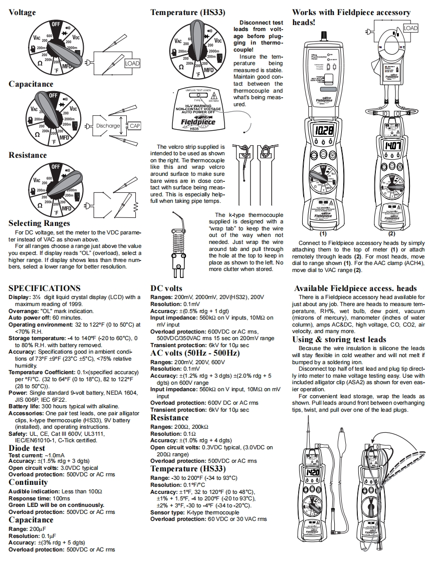 DIGITAL STICK METERFor your safety.…Limited warrantyMODELS:HS32,HS33General:Disconnect the test leads before openingThis meter is warranted against defects in materi-the case.Inspect the test leads for damage to theal or workmanship for one years from date of pur-insulation or exposed metal.Replace if suspect.chase.Fieldpiece will replace or repair the defectiveNever ground yourself when taking electrical meas-unit,at its option,subject to verification of the defect.urements.Do not touch exposed metal pipes,outlets,This warranty does not apply to defects resultingfixtures,etc,which might be at ground potentialfrom abuse,neglect,accident,unauthorized repair,Keep your body isolated from ground by using dryalteration,or unreasonable use of the instrument.clothing,rubber shoes,rubber mats,or amy approvedAny implied warranties arising from the sale of ainsulating material.When disconnecting from a cir-Fieldpiece product,including but not limited tocuit,disconnect the "RED"lead first,then the com-implied warranties of merchantability and fitness for amon lead.Work with others.Use one hand for test-particular purpose,are limited to the above.ing.Turn off power to the circuit under test before cut-Fieldpiece shall not be liable for loss of use of the00ting,unsoldering,or breaking the circuit.Keep yourinstrument or other incidental or consequential dam-fingers behind the finger guards on the probes.Doages,expenses,or economic loss,or for any claim ofnot measure resistance when circuit is powered.Dosuch damage,expenses,or economic loss.not apply more than rated voltage between input andState laws vary.The above limitations or exclu-ground.All voltage tests:All voltage ranges will withstandsions may not apply to you.up to 600V.Do not apply more than 600VDC orService600VAC.Call Fieldpiece Instruments for one-price-fix-all war-AC tests:Disconnect the meter from the circuitranty service pricing.Send check or money order forbefore tuming any inductor off,including motors,the amount quoted.Send the meter freight prepaid totransformers,and solenoids.High voltage transientsFieldpiece Instruments.Send proof of date and loca-can damage the meter beyond repair.Do not usetion of purchase for in-warranty service.The meterduring electrical storms.will be repaired or replaced,at the option of尚百△MaintenanceFieldpiece,and returned via least cost transportation.o常器Built-in magneticClean the exterior with dlean dry cloth.Do not usehanger.Fleldpieceliquid.Battery replacement:When the multimeter dis-plays""the battery must be replaced.Disconnectand unplug leads,turn meter off,and remove the bat-tery cover.Replace the battery with a NEDA type1604 9V battery.FielFieldpieceDesigned inusAOPERATOR'S MANUALwww.fieldpiece.com.Non-contact voltageField F calibration (HS33)Symbols used:With the red NCV tab on the tip of the meter doseFor accuracies of F calibrate the HS33 to ato an AC voltage,press and hold the NCV button.known temperature.A glass of stabilized ice water isCaution,risk