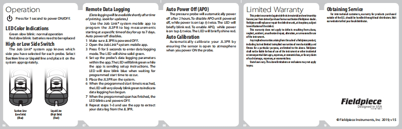 FieldpieceQuick StartDescriptionMaintenanceSpecifications】lhhe开ldpiso Jo地Linksywm apponT0儿3FRJe地Li诚+System PrssurCLEANING:Coan the excerior with a damp制mut Devk4 nas4ndoth Do not use datergents orsolvnts.Job Link Systemoumobledeviceand ign uploranaccoutPe边e级n达iong range恤ele经P图u图Iyo're a new ufor.ur omn路d金acdy to th0Heiw0eJo边BATTERIES:Whwnthe LED slow blinles Ridhe batedes must be Nplaced Erure the4e1g家leheprenurePressureLl"到mme地ile0Conmc ta Typ:Surdrd1/NPTfeke fme ftiglrd ec)coverandinnl2 xAAA botres.Easly reach service ports in tight spacespower is FF.Removethesingle soewfrom the围Nm成RnoProbe3 Rress tlfor I secondto powronusing the anglad V4"fting.The rubberadyelow bamery covr lnstal 2 x AAA bttedies.1y出作e道p,J4a出yee4位ch4 Opan Mansuramen路hebL城appandprotective housing is bot engonomic andou canalo monivor bat trylifein the JobLink这E9wdad出ly uieapp tool manoger1y修幢e0s坐过“a些作e0a生1a时OPERATORS白orite the pro边eot0 ool managu.5 Vewlivemunmentson youmobildeviceFip the swich to red or blue and the appG5K日:Tehd或边erg9eth里01宜te2up to 350 feot aweryimmadiatly knows which side of the systmthe pressune probe to the service port mayMANUALyo'ne going to phce your pressune probe.bcome wom over time potentially causing多可第家力从A4AECgWhat's IncludedB可你度asg园a山上远L鱼H性shnModd 3PRThe perect balance of size and capabiitya leak This nsults from or地Link Systm Prossure Pro边econnc ting to dama gad servioe portfmings.上信青国日:唯色r.2x Riplacemant GaasketsAuto Pow Of:Zhan(APO cn becinele)ym至d出in and day out quickly and1 Uke neede noce ples or a simihr tool to情m Rngt:1堂at们dda上sf寸共2x AAA Battaries能krsu过dtr这Oporator'sManlIYoar山tadW的图ny2 Ramove and replace th worn gisket.上售密io41maw在c和nt或1ak应fed amc pir1T1Tte线作,a下e1过用m1T光e1,2光0情ber Reshant De水mtxl月影bat:wwfide年送0anh量r由WARNINGwwweldpinojoblirk.com