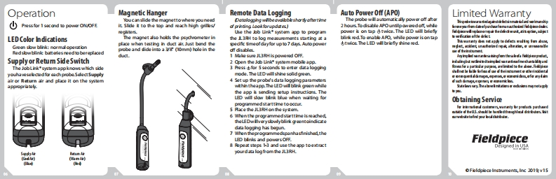 FieldpieceQuick StartDescriptionMaintenanceSpecifications】lhhe开ldpiso Jo地Linksywm apponThe J3RHJoblinke Sys om RePay drometorCLEANING:Caanthe exterior with a damp相mumc转周过mtProbe sands air maasuaments dincly to tdoth.Do not use detargants or solvnts.Do notJob Link Systemoumobiedevioeandignuploranaccount性Iyo're a new ufor.Fieldpisce边app upto3Ww球touch he saror.BE可1家1五从AECU定Meoune %RH,dry bub,wetbulb,dew pointBATTERIES:Whon the LED dow blirks RdFlex PsychrometerB可你度asg以a山上送L鱼H性shncoverandinnl2 xAAA botres.and enthalpy at a regisrgrillle in the duct,orhe batedes must be Nplaoed.Enoure the上信青国日:¥准色r.3 Rress tlfor I secondto poweronju wallking around.Band the fodble probe andpower is CFF.Removethesingl sowfromuto Pow 0:has0 cnbecht线Probe4 Opan Mansuramen路hebL城appandlow b山ry covE.lin由l2 x AAA botteries.情m Rngt:1堂at们dda上sf寸共tvorte the probe tothe tool manag.JL3RH to your su onMonbor ba mery life in the app'stool manag使dicesa过dtraOPERATOR'S5e0 e praecive slip0wr0mt单The mubberiad prowcive housing is bothSENSOR CARE:Cover the sersor with the。a下r时MANUALengonomic and rugged for daily use.Fip thep0350 eat aw以swixh and app immdhtely knows whichor eposune to solvent vapor may oftet theside of the sysem you'he going to place youRH saror.Torcalbt place the sersor ina1maw在c和nt或1ak应fed amc pir1TModd J3RHUTee气,下e1拉hm1t光1,2气e40What's Includedb山nk Sysem Flx Pay cheo城tPe边e68F .86F for a perodof 24 hous.Toorate aatble Probe0起”6山d;8”0mrdhIRroxctive Slp Cover796RH arviroemont,add wot salt to a ckanbat:wwcfde好canh量t由2x AAA BateriesRelative Humidity(%RH)Oportor's Manuallot the solution touch the probe Place thisamioeTypi:年ropdye AmYear Limitod W的an时continr and the probein a large soakd bogMnw金士Htecd6 aniad INb宽wte1G4ueaw1 m:60ucond tyeiclfo复线eftdragWARNINGTemperatureewt当gt do mt di hdesH忙hrea由nmd4e1下1线wwwe中ojoblirk.co9行e业f,1u下e14所,9-r光e气4元e元