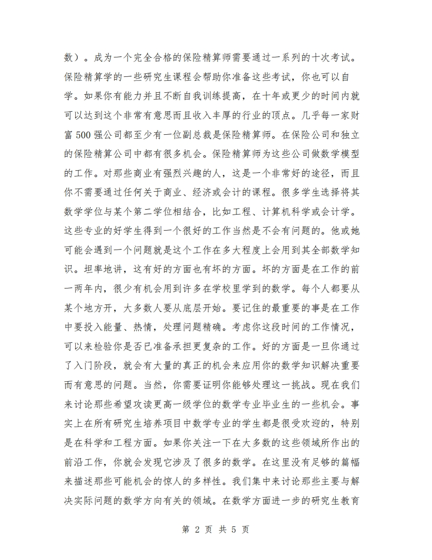 数学专业毕业生的职业生涯规划书数学专业毕业生的职业生涯规划书综合计划数学专业毕业生的职业生涯规划书规划职业生涯毕业生专业数学数学是解决问题的语言,是所有科学和技术的核心。接受数学教育的优点是使你可以自由地选择从事任何你能够想到的技术方面的事业。我们下面简要地介绍一些数学专业的学生可以从事的常见的事业。我们也会对如何利用数学来解决实际中的问题从而在工作中获得成功给出一些建议。大多数学生所考虑的第一个问题是直接工作还是继续攻读更高一级学位。我们就首先介绍数学专业的大学毕业生和硕士研究生可以选择的丰富的就业机会。当前数学专业的学生的首选工作是计算机程序设计。预计对胜任的程序员的大量而且呈稳定增长的需求会持续相当一段时间。数学专业的学生比程序员的平均水平要好。雇主也知道这一点。为获得大多数入门水平的工作的资格,你所要做的就是完成三到四门计算机课程,包括一门数据结构、学会一种通用的编程语言,比如、fortran或obol。通常不会要求有计算机的学位,这是因为没有足够的计算机专业的学生来满足空缺的工作需求。计算机程序设计是一种有很好销路的技能,它可以为你打开许多扇门。当你得到一份工作并证明你作为程序员的能力后,你会发现许多其他的机会会自己出现。数学专业毕业生的另一个很好的工作是保险精算。保险精算公司经常会只根据其在学校中的成绩来聘用一位很好的数学专业的学生,但如果你确实对保险精算有兴趣,一个很好的做法是在毕业之前通过保险精算的第一次考试(包括微积分和线性代第1页共5页