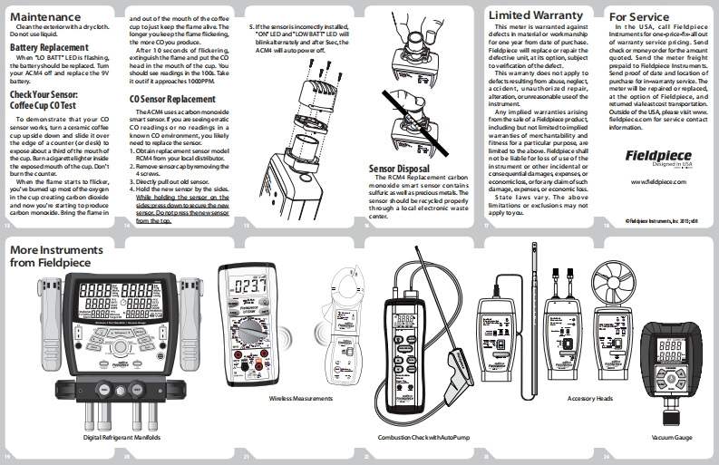 FieldpieceQuick StartDescriptionPrecautionsI.estalll W bottary (nd小ud0The ACM4 carbon monoxideL Do not measure gas engindacossory head mesuns carbonWARNING△Carbon Monoxide3.Select the mVDCrange on DMMmonooide in ports per milion (ppm)corTamind gases.High lwek ofAccessory Head4.Slde the power switdh to ON andItis in nd ed to masune lvelsOandofercontminantscninallowthe wormup to completeadCo的ill2 m biant air.The mothe sarorand be a healh hazard.OPERATORSNaeG的and red LEDs wi Nghtpmcical applica fion of the ACM4 is2Daa白e035 ngs dinctly inedew0量candsto datermine if the indoor COlavelsmamof airat rogisor or n a fue.CAUTION AMANUAL5.【eaea%正0h0aM40ane higher thon oudoorlevekandto3.Allow anough time for ACM4 toatmosphene with no cabon mon0 min te source.nmaryc≤Moddoxde (COit can hdplocte a souce d CoHThe ACM4usaf五t Nacingwill be disphyod in partsnon-roplaceable filter to filrper mlion(opmcoume dmicakandanexly beout wace concan tadons of sof.白ru.7.Power ACM4ombydidngthpowerN0.and most hydrocarbo■Minch to the O开por通oa0互hamfulcmick auch asmhonolCertificationssthanol,or dirt,the filr canh宝n址Ets每aeta年意tueat拉rr铺-置气线baicgn wrsas sh地C-Tic (N22675)dC0to中0riogak年CE正WE正ntus d he出aRoHS ComplantHow to UseZero AdjustSpecificationsCO Detectors andCO Exposure Effects1.Comect COM andVolssjadksusingAs ndaded,tthe nading to 2onPeH红nt souro0金QfCQ金xhFieldpioce deluoe test leads.Fora known xo CO atmosphne andinaas malfunctioning combustionmsp出dohenical(pnd作e(wCracked Heat9阳四刻m(dtra女rfh在南止rt绿道平n道fa维as锅ndR辉Fieldpiece "gick'mexer,slde thetap0uwil证003gleExchangershead droctly over hhe mevttobe testod Zoro only whan ambientbe servioedimmdiatly.These can药阳aa tor corimous eapoo我trewu正™dSRe2.Select the mDC mangear is wthinspedfca fons and probebe Ife thraa tring.H山Acourac g康T:,dwUHA CO desector cannot tell you3.Pow r ACM4onbyslidingthe powr1牛mw量上车士1年ner道d年if a heat exdhanger is good.A CO0阳m边x te ddt hous0swixchtothON postionandalowrdative humidity)wih ambiert.make suetha younevr putyou量detector can indiaate tat a heatsinmlledC0dt经L04w相p000gl0经To zero,removing the protectveor anyone ake ind山nger of ercessivrechanger may be cmcked oolyifdhesa maeapooue of100童4.Tke the outside and非年有年可In to to the转eu2d维adust it to 20to.Thn bring insidescrew.Using the calibmtion Toolcan hivelong-oarm heathMecs ard0Arn油mpirure Rang:3Ito花TmJoslyo口e m20uNmntprovided,tum the calibra tion sogwcabetal0 oening Bironmmne1e1立下◆eLThe fame must ganrate high con05.E3oi0r@oa载leuntil the display reads ZERO.(Now:cantrrions of Co dack of oxyganGO O0S IMIILanle收prcauticn)The dsFor safety Nasoe the ACM4 willl notAverage Switchborage ronmin进e线Ttetc置wLt比ny国ocfcn mtexoss fud,high tmp)In oe ortvo houg foncdplay nacts to the presence of Co0no置w3 ingisab0e5pp)The averge swixh averag es the2Enoughoaugresmustbemt山hes hthree han空e0国reading over the last two or threeear恤g道104dsmaNading sbilies."Walk Around"Testscondks.Thisallows the user to ad3.The exhaust gases ffom the crackeaposue of15 minunes.6.For inisal tests wak around themus