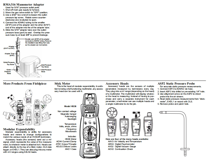 Dual PortDescription6.Sdlect P1,P2,or P1.P2.cations on target nlet and oufet pressure for aDifferentialThe ADMN2 is a portable dual port manometer7.Seect Engish (nches of water column)orgiven regula tor or piece of combustion equip.accessory head.The ADMN2 is capable of takingMetric (mBar)units.ment.Manometerg部peJ吧ase量as static poe岁u隐.The8.To disable the auto-power-off,remove the rubAccessory HeadADMN2 also has a zero adust.The auto-power-affber covering and新o the swilch below.Au的-function conserves battery他,but can be disabledpoweroffis helpful for conserving the battery:Field Pressure CalibrationModel:ADMN2fada轴logging if d地redbut if you are d由a logging with Feld中ece modelRemove the rb的covering the正R0 button.DL3,ou will want的disable this fe山r德.By pressing the ZERO bution,both the P1 and P2The ADMN2 will allow you to take gas pressurebetween -60inWC and 60inWC.The ADMN2 can9.If you are in an envionment where the tempera.e zeroed如hea白ient pressun德.For this re30mture is nosceably changing whle you are takingthe caibrafon should be done when both P1 andmeasure P1 or P2 pressure readings ar the difer.your readng.disconnect the meter from theP2 are disconnected from the hoses in ooder toence between P1 and P2.The ADMN2 also has twodifferent measurement scale客:inWC inches ofhoses and ZERO it relafive to ambient pressureproperly calibrate to ambient pressure.water oolum)and mBar.Stafic pressure is possitlebefore each reading.with the resdlution of 0.01inWC or 0.01mBar.Connect Your WayChecking Gas Pressure on a Regulator1.Screw the brass ftfing into the pressure portonOperationthe regulator.1.Comect to COM and Vots jacks usng any2.Put unit into operation Le.turmn on the fumnaceField piece糖st lads with removable pro的epsand have fumace ignite,as if running t in nooFor Feldpece stck-s分e"meters,日HDL1,ormal operation.)DL3,side the head directy over the meter.3.This will give you the pressure coming out ofthe2.Select the mVDC range.regultor.3.Zero the ADMN2 by pressing the ZERO bution4.If you suspect high or low inlet pressure into theus线before taking the pressure re3dfng华,hleregub for,the manomeler can hook into the inletat ambient pressure.This will zero both P1 andport in the same manner t can connect ino theP2outlet port.If you have a dual-port manometer,4.Conect a sngle ho幼如get the gauge pryou can check both the inlet and the oufetu随raf港的he ambient or ZER0res岁u随simutaneously and see the pressure drop5.Connect both hoses f you want to see relafiveacross the regulator.OPERATOR'S MANUALpressure,P1 minus P2.EHDL15.See manufacturer's specifica fion for the specif.DL3SpecificationsResolution Modes (0.1 and 0.01)Ony when using 0.01 mode,the disply of yourWarrantyPressure Ports:Two tube conecloes for 4mmThere are two modes of resolution on themeter wil show the true measurement X 10.So fThe product is warranted to the orginal purchas(3/16 inch)L.D.feble tubingADMN2.For most applicafions,0.1 mode will bethe true measurement is Q08,your meter will showsagn时deec书in