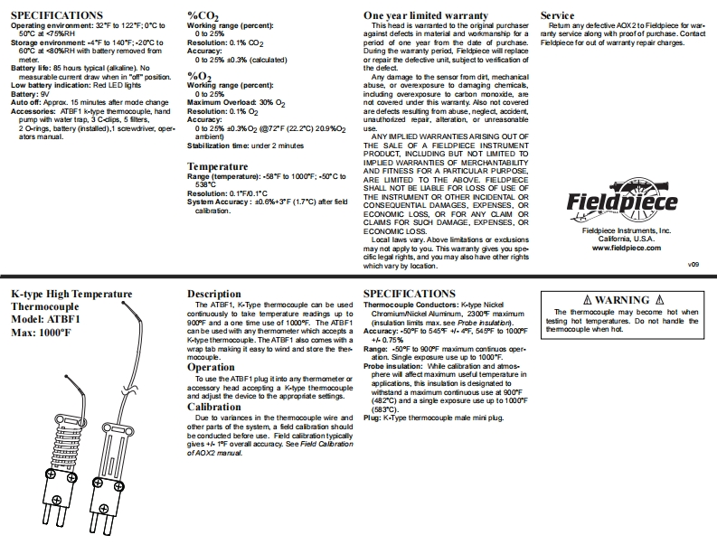 Combustion CheckDescriptionUse it your wayAccessory HeadThe model AOX2 combusson head measures%02 and temperature of fue gases and can cabuModel:AOX2lale the %002 found in the products of combustion.The AOX2 is designed to give you some basic infor.mation about the combuston process being ana.lyzed.The AOX2 comes with dips for mourting thethermoo0pe帕e end of the pump sno0L,awa能rtrap and fiter with replacement flers to keep thesensordean and free of moisture and a hand pump6fam1 al aspira So们de1Since %002 is calouated based on a knownfuel,the %C02 reading is only mearingful when00testing combustion products of the selected fuel.EHDL1 AHDL1 WDMMDL2HS30FlcldpicceFieldpieceOPERATOR'S MANUALHow to use6.To purge the sensor and pump any lef-overWater trap with filterField calibration1.Comect to COM and Volts jack.Side AOX2contaminants from the poevious measurementsOver fme the fiter wthin the waterTem perature:To calibrale the temperature sensorcombussion check head ono Fieldpiece "ssck"pump uncontaminated ar nto the AOX2 for onetrap wil get dirty and evertually blockadjust the caibea Sion pot undemeath the rubbermeter,data logger,electronic handle or comectminute be fore inserng i into the fue.aidfow.Periodically.check the flter forcoverfing whle measuring a known temperature.lo mast other melers using Fieldpiece ADLS27.Select fuel type being burned OlL or GAS.exoess d山l,de山色,0rc0 ntaminents.eew触rsey白绝帕32 F and is readlydelue test leads orAHDL1 hande.8.Youm时vait unsl the system怕u are testng1.Compress and twist cap toavalable.2.Set meter to mVDC range.has stabiized completely before you can takeopen the case.1.Stabiize a large cup of ice water.3.Caibrate if needed (see Fied calbra Son)accurate readings of the fue gas.This means2.Replace O-ring if t looks2.Seed TEMP on the AOX2.4.Clip the thermocouplethat the temperatures throughout the systemsc3cked灯n3.Make sure the appropriate degree scale isto the snoot of theNO YEShave stabilized and there is a steady fow offuel3.Replace fiter ifit looks dityselected.The scale select swich is undemeathAOX2 pump using thein the furnace.or dogged.Make sure you智etob地tinduded dips making9.Disable A的o开的超a bg any of the parame-orent the fter as shown4,Plug in the ktype thermocouple and thenue的bend the beadters with the DL2 data logger.with the knob of the caseimmerse enre metal Sp into the ice waler.Sp (see photo)for10.Onoe the system is stabilized and the AOX2gngn的he bottom of the3.For opfmum accuracy at ambient pressureopimum accuracy.has been purged,nsert the snoot into the fuetadjust the caibra fion pot to read 31.3'F or5.Before inserting thegas.Select TEMP function and pump vigorous.4.Twe1cap3ckm的8tap.0.4'C,depending on the scale seected.AO2ir的the fuely unti the temperature stabilizes (Usualy undere小e11e3g2 minutes).ap移8 curely fa11.Now ead temperature of the fue gas,%02 arened on te meer%CO2 directy an your DMM display by selectand湖a坐n法ing the appropriate swich postion.Make sureis installed propery.to keep pumping an