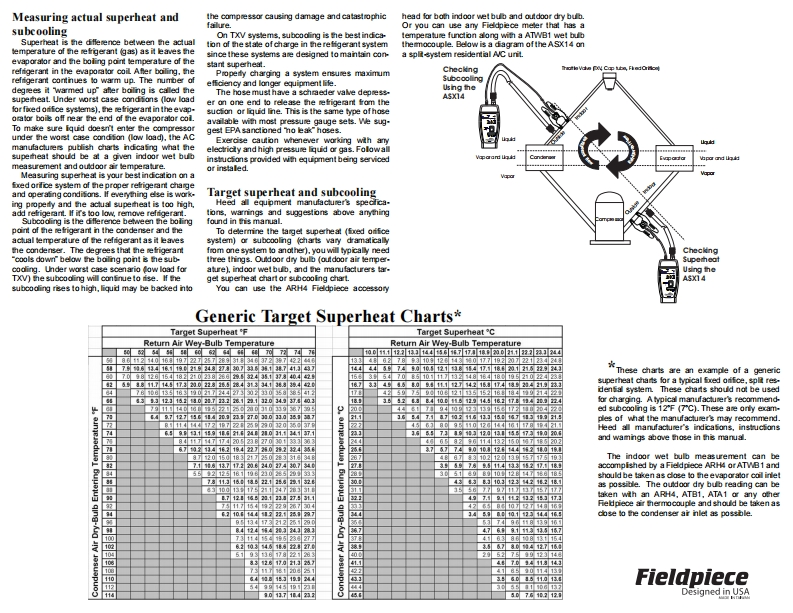 Superheat andDescriptionHow to useField calibrationSubcooling Head forThe mode ASX14 superheat and subooding1.Comect to COM and Voits jack.Side ASX14Tem perature:To calibrate the system (ASX 14.accessory head measures refrigerant pressure andsuperheat head onto Fieldpiece "sSck"meler,pe由p temmocouple,meer,adu时iecaR22 and R410Atemperature simutaneousl.I then caloulates anddata logger,electronic hande or connect tobrason pot undemeath the rubber covering whilewith pipe c山hmpdisplays supereat or subcooing.I has a 1/4"most other melers using Fiedpiece ADLS2measurng a known temperature.loe water is 32"Fthermocouplend时y抽ndard ftng和r actual pressure.A pipedeluxe test leads or AHDL1 handle0C)nd is re3da由edamp thermocouple is induded for temperature.2.Set meler to mVDC range.Model:ASX141.Stabilize (by repeated sfiring)a lrge cup oficeSeledt R22 or R410A.Seledt superheat or subood.3.Calbrae if needed see Feld caibrason)ing.Select engish or metic unts.4.由ndfg触n14"re帕uca们ne or liquid2.Seect temperature on ASX14,plug in the pipeUse it your wayneas d0地t0reep0的rc0 ndenser ascamp themmocouple and then immerse entrepossible using凯EPA即proved servio法ha关出mpin的he ice water(飞eep string)(not indluded).3.Adjust the calibrafion pot to read 32.0 0.0 if5.Select supetheat or subcooling.refrigerant (R22using 'C)on the DMM for opfmum accuracy ator R410A)and units (Engish or metric).room temp.6.Comect the pipe damp to the sucfion (superPressure:The pressurevacuum reading prior tohea0aqud(白cooling)line at le:立inconnecting to an A/C system should always bees from the condenser and slide it under thezera.If you see tat you're geting pressure readinsulation for best accuracy solating the pipeg华af0 mething other tan ze0it0怕urg叫clmp from the ambient air pg.2).ce hose attached,you need to set atmospheric7.Select parameter如display (supe血eaL白-pressure before connecting the ASX14 to the sys.co0fg,sue,0r2p世山e.m.T白4 mospheric pressur色,e世梦eb如m008.You mus时wait unt日he system you are tesfingundemneath the rubber covering ensed Set ATM".has stabiized.The STABLE LED lights when的uayh的e0T0s℃ure eadthe reading i这aDefme you dramascally change eevafions.For excam.9.Disable A的a开的超t超og any ofthe省0eple,ifyou"Set ATM in Derver and take a pressurepame物s with the DL3超t超agggeading of an AC system in Los Angeles,the pres.Fieldpiece10.Once you have the supereat or subeoolingsure reading in Los Angeles will be bwer than itreading follow the man由cturer of the air conda山雪y这.OPERATOR'S MANUALEHDL1 AHDL1 w MeterDL3HS30tioner's specfcasons to properly charge ordiagnose the systemSPECIFICATIONSafer ice water calbrason (see Fied caibraSon).WarrantyOperating environment:32 o 122F;OPC toPressure and vacuumThe ASX14.Superheat and Subcoding accesso509℃a175%RHWorking range (pressure):ry head is warramed against manufacturer's de fectsAow5 min.forAS14如eome如ambient temp.0的500pg004000kPafor one y地at.Ths waranty does not apply的Storage environment,4℉a140F:-20℃oMax displayed pressure:800psi (5500 kPa)defects resufing from abus