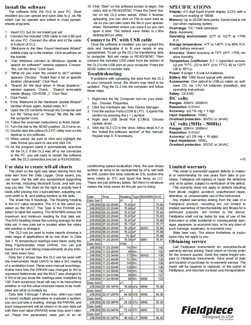 EXPANDABLE DATA LOGGERDL3 Data LoggerClear buttonMODEL:DL3The DL3 data logger records mV signals from anyUse to clear saved data.This function is only avail-Fieldpiece accessory head.It has an internal realable when on READ/SEND range.Press CLEAR andtime dlock.Program automatic recordings usinguse and to select N(o)or Y(es).Press ENTERSPAN(the time over which measurements are made)to confirm choice.and PER (time period between measurements).TheRotary dial functionsnew TRIGGER feature allows the DL3 to start andTIMEstop recording points when the data is oustside of aUse to set time of day.Press ENTER,select min-specified range thereby only recording the data thatutes,hours,days,month,and year with andis meaningful to you.Manually add single measure-Change value with and Press ENTER whenments by pressing record.You can readout the datafinished.from the LCD screen using MIN/MAX/AVG and arrowSPAN8888=buttons,or you can send the data to a personal com-Use to set span of recording.Press ENTER,selectputer with a USB port to view as a spreadsheet.unit of time (Sec,Hr,Min,D)with and and2Data setsadjust number with and Press ENTER whenfinished.USB-ACreate a new data set by changing the rotary dialposition outside of the measurement scale of the pre-PER (Period)vious data set.Each data set has a MIN/MAX/AVGUse to set time between readings.Adjusting Per isand one PARAM (parameter)labelidentical to adjusting Span.PARAM(Parameter)Start buttonUse to label readings.Press ENTER,select posi-Begins the programmed recording defined byTIME,SPAN,PER,PARAM,TRIGGER and MULT.tion to change with and Select character withAvailable only when an input range is selectedand V.PARAM is the "Type"column in the xls file.MULT (Multiplier)Connects to(200mVAC,2000mVAC,200mVDC,or 2000mVDC).Use to set value to multiply data when uploading tocomputer to inputStop buttoncomputer.Press ENTER,select multiplier or divisorreadings.Use to stop recording.Pressing Start resumeswith A and V.Press ENTER when finished.recording in current data set.Only changing dial posi-READ/SENDtion terminates data set.Use to read saved data.Press the MIN/AVG/MAXBacklightbutton to read minimum,average,value of currentPress backlight button for the blue lighting of thedata set.Use and to scroll through readings.display.Will automatically tum off after approx.60Use and to change display of data descriptor (sec.date,year).The DL3 has wrap scrolling,press up on#1 takes you to the last date point saved.Hold downFielRecord buttonPress to insert a single measurement to the cur-the UP and DOWN arrow to scroll faster.rent data set.If you are in the middle of a pro-Also used to transfer saved data to a PC.PressOPERATOR'S MANUALgrammed recording,the single measurements will beSEND to start transferring saved data through theentered into the data set according to the time it wasinduded USB cable connected to your PC.±Triggertaken.Select the Hi or Lo trigger by pressing the orTwo ways to connect to yourbuttons,press ENTER t