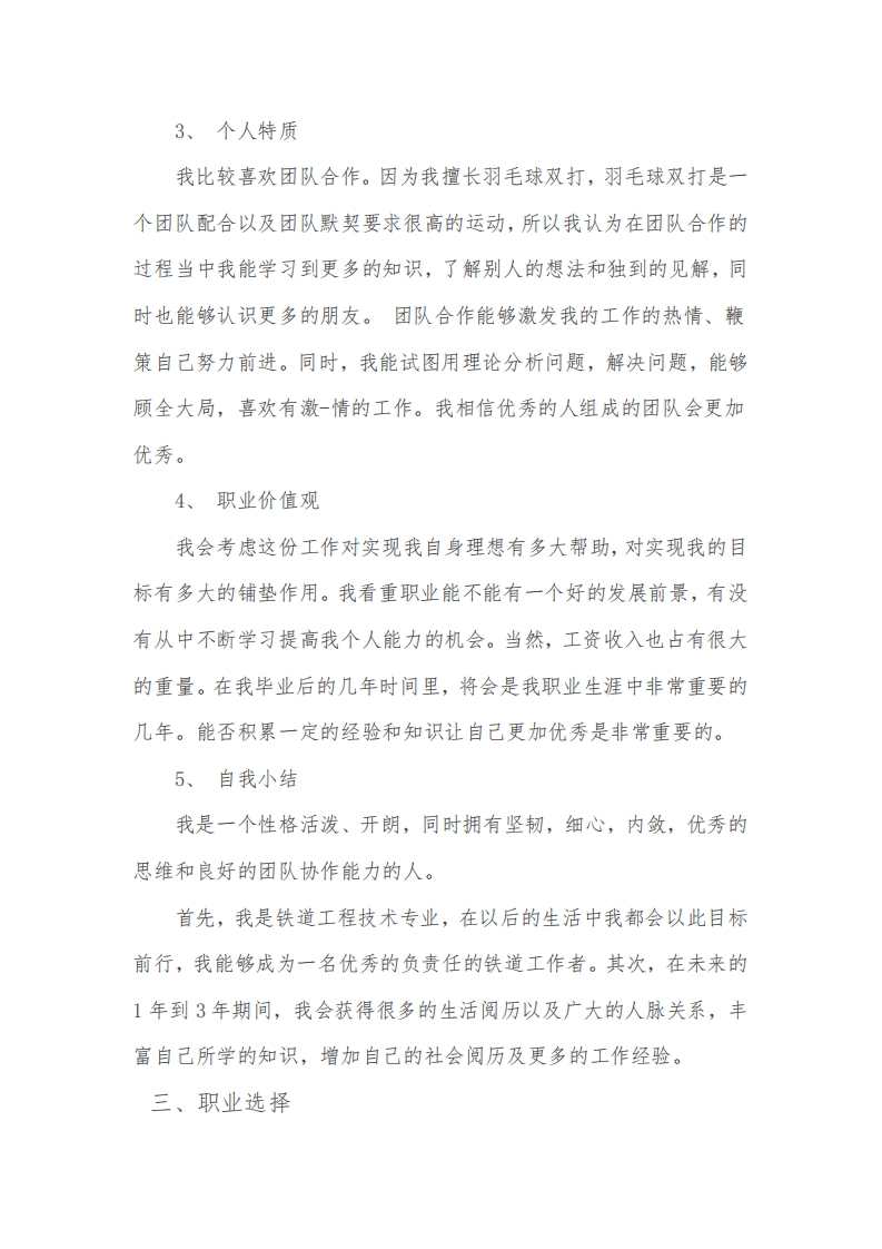 铁道职业规划书一、前言俗话说的好:没有规矩不成方圆,没有一个确定的目标和一个完整的人生规划,在这个竞争压机如此巨大的社会中我们注定将会是社会的淘汰品。每一秒我们都在面对一个崭新的生活。机遇和挑战无处不在,成功,它来自彻底的自我管理和毅力。只有树立一个正确方向我们才能勇敢向前,向成功,向梦想靠近。为自己拟定一份职业规划,帮助我发掘自我潜能,让我更加清楚地认识自己,树立明确的职业发展方向,找到自己的人生定位。二、自我分析1、职业兴趣首先,铁道工程是我主修专业。其次,我也深深地为能够进入这个专业而感到荣幸。同时,这也是一个在全国范围内新起的热门专业,它具有很大的发展空间,所以,我的职业兴趣是做一名优秀的铁道工作人员,让大家可以放心坐每趟火车。2、职业能力我相信,只要有信心、有热情、肯投入,就没有做不成的事。身为理科毕业的我,拥有良好的逻辑推理能力,我的学习能力较强,细心、坚韧、能和别人友好相处、有良好的团队协作能力。同时,我修取了具有专业知识的各总证书,我可以作为管理和专业一体的复合型人才,也为我实现自己的规划而打下一定的基础。