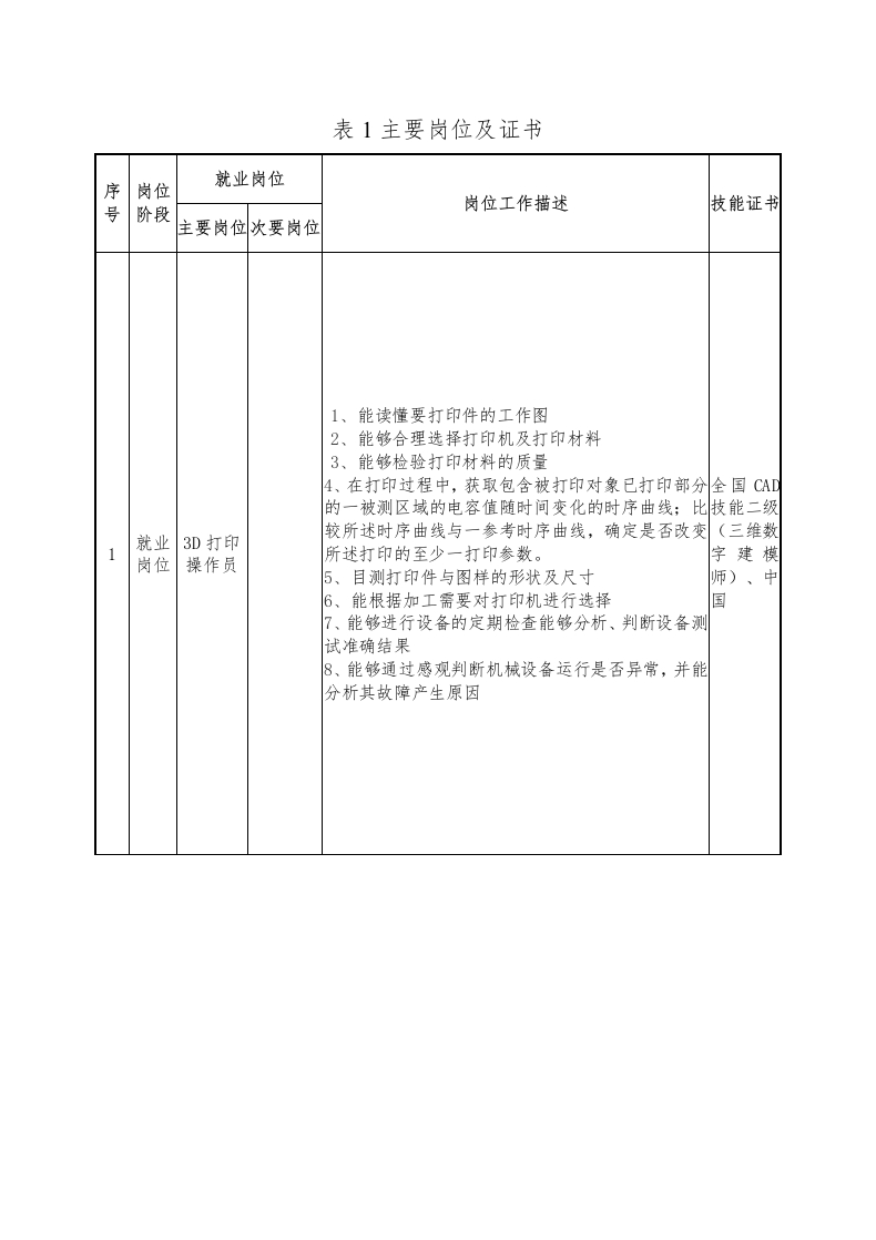 附件机械设计与制造(3D打印技术)专业人才培养方案一、专业名称及代码机械设计与制造专业(专业代码560101)二、入学要求普通高中毕业生、三校生。三、修业年限全日制三年。四、职业面向本专业毕业生初始就业岗位为机械制造各加工工种岗位,从事通用加工设备、数控加工设备的操作,简单机械系统设计、机械零部件测绘、计算机辅助机械制造等工作;积累工作经验后升迁就业岗位为机械设计师、机械工艺师、机械制造技师等岗位。根据就业地产业发展需求及企业实际岗位需求,还可在相近的各加工工种岗位,如模具设计师、模具制造技师等岗位就业。