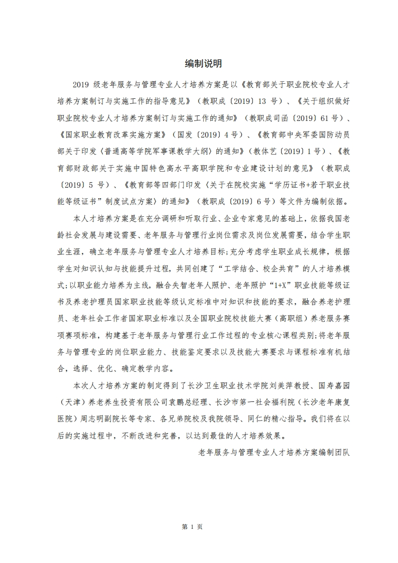 2019级老年服务与管理专业人才培养方案348072@abc3个月前发布关注私信1.36MB57页0242019级老年服务与管理专业人才培养方案此内容为付费资源,请付费后查看¥14¥18黄金会员免费钻石会员免费立即购买您当前未登录!建议登陆后购买,可保存购买订单付费资源 第1页 / 共57页 第2页 / 共57页 试读已结束,还剩55页,您可下载完整版后进行离线阅读 THE END实习实践实用范文心得体会招生策划教育学类毕业设计管理学类 文本预览 中国人寿保传织业学院CHINA LIFEINSURANCE PROFESSIONAL COLLECE保险职业学院专业人才培养方案专业(方向)名称老年服务与管理所在系院保险职业学院专业教研室健康与照护教研室专业(方向)带头人谢隽制定时间2019年1月修订时间2019年8月(第3次修订) 查看更多 收起部分 喜欢就支持一下吧收藏