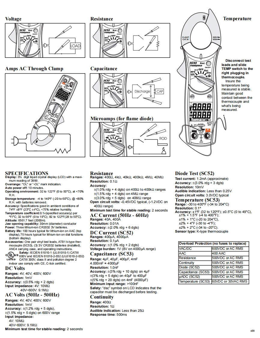 DUAL-DISPLAY DIGITALDescriptionthe top display on again."APO"is shown on the dis-AUTORANGINGThe dual-display clamp meters can simultaneous-play to let the user know that there is an Auto Powerly measure amps through the clamp and amy of theOff feature for this meter.APO cannot be disabled.MINI CLAMPfunctions on the dial of the meter.The amp clamp canTemperature(SC53)METERS:be tumed on and off independently from the rest ofTemperature measurement will be accurate eventhe meter to save battery lifein fast changing environments because of excellentSC52,SC53Non-contact voltagetemperature compensation.Press and hold the NCV button.When the clamp1.Remove leads and slide the Temp switch to thetip is close to an AC voltage,the NCV LED will lightright to close lead jacks.and the beeper will beep.The closer you get to AC2.Plug any K-type themocouple directly into thevoltage,the faster and louder the beep.The NCVmeter to measure temperature.function is sensitive enough to detect 24VAC on ther-Field Temperature calibrationmostats.(24V to 600V.50Hz to 60Hz)(SC53)Capacitance (SC53)For accuracies of +1,calibrate to a known tem-For motor-start and motor-run capacitors,first dis-perature.A glass of stabilized ice water is very closeconnect the capacitor from power.Discharge theto 32F (0C)and is usually very convenient but amycapacitor by shorting the terminals before connectingknown temperature can be used.to meter.Disconnect any resistors that might be1.Select 400F/C range and connect themocouple.between the terminals of the capacitor.If the capaci-2.Remove back case(2 screws on back,one neartor is connected to the meter and dsc"symbol isdlamp,other near base).Leave battery covershown on the LCD,there is voltage in the testedattached so batteries stay within back case.capacitor that needs to be discharged before testing.3.Stabilize a large cup of ice water.部BBBHold4.Immerse the thermocoupleThere is a separate data hold function for eachtip and let it stabilize.display.The HOLD button on the side of the meter5.To change the temperaturecorresponds to the AAC function and top display.Thescale from F to C.closeHOLD button on the face of the meter corresponds tothe black jumper justthe dial functions and bottom display.To keep the lat-above the spring.est reading displayed on the meter.press the HOLD6.Adjust VR2 calibration potVR2◆出button relating to the display you want to freeze.with a small screwdriver toJumper-Press the HOLD button again to go back to nommalget within 0.1 of 32Fmode.The hold symbol ""on the display will then(OC).Each 1/4 turndisappear.should adjust the tempera-ture about3°,no moreAuto offthan 10 total.There's no need rotating the screwBoth displays have separate auto off features aftermore than360°:doing so gets you back to whereField10 minutes of user nonoperation.The meter will beepyou started.to announce the meter has turned off.If the ON/OFF7.Attach case without screws to preview the temper-button is depressed when the top display is automat-