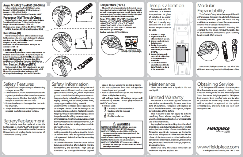 FieldpieceQuick StartDescriptionControlsDisplayL For dectical tasing,connoct test laads toYour SC54 a swivl damp moner spedalyC0Mrd”4'白dkFa0 mpar a.revsing.Bamtery Life hdicatorSwivelmove test lex出and slide T日P switch toon the SC54alows you to got a good viewingAuto Power Oef Enabledtw ghtangle on he display whie taking ampragHigh Vol白g0 hming43MClamp2.Rotane the diall to yourd esind func fion.Pressadings through the damp,rogardess of theMmlRanging至L cyde theough the parawtHOLD Data HoldModetheswich podtionMeterou wont asan HVCRcheid鱼nMAX Mxximum Raading3 Comrcttoxstpointsand nad masunomentGot fast manul mnging parfomance onanMINMinimum Riading0md0b学asy to ue auoranging damp miter.Coerinuity TestOPERATOR'SThe SC54 is compatible with Fieldpiece在h9 ncy Test (hert回MANUALCertificationsaccessory hadsallowingyoutomasuremanyRe由nce Test (oheModd SC54The bright blue baddight mles t dasiarMico Unit (o,one millonh)e④aUL 61010-1,Second Edifiontoue in any lghing condifon.TruRMS hipsRotte dal to the function youwant to ue.Mili Unt (104,one thousandh)CEIEC/EN61010-1adingson varble fhquarcydrives.③Cyde through p9a城ars or mngesIEC/EN6101C20阳2The unique tmpratune drcuit allows hewthn a didposiionEMC EN613卫6-I白s证n moving from arcof top to afreeORresstoilluminae badlight for 3 min8888&C-Tck(N226758888you to he on you 54WE正wiout hasle9adingMAXMINHOLDnHzμFAmWCATII 600%dass I and polluion degree 2F'C DCACndoor use comply with正,RcHS compli3tSpecificationsFunctionsMicroAmps DCμADq0i山学就ICceut与had此t址Voltage AC(VAC)(50Hz-400Hz)d.kan0 wrangic(0Lor EOL)h ci山rrta卡s成meE时时成据marata.k上aaut地A收实l第山与世ea健n成r地k1ia送a4r运lwtfo trskemirfdut心ap。t tomn通cefction teddemirefRng CtoeoD Resol山ord.N0,rating tnircnm an午eu下0Te坐9重twAcoc学0w+d纳宝1位地山t士与ng就aduh时art1hean时ae-作e14T-Te,0e置wHcaunact0w+ee城oe burdir:WOwrlad Pro2 x tone eaC a0N机mhoutmpudinoi 1hdlem pira/unecofhdon01a年hto这r着T家气e10下ee用,1erC套Tw世WFrequency (Hz)Through Leads0kar0n年ansVoltage DC (VDC)ruth与9年重0LCee高u可5kd性Samerylife:100 heurs tygiclalulied长ws健ebgLor bap2 ryindicabon台量a,红vllb m年有人1量”如字=3w+号刻w向d竹m@rrg.””””””==5””””=”””忙杆eL1是cimd.c年w从宝u皇f0工tapadtance(MFD】MilliVolt DC (mVDC)h或lw点du提ata威uae时eanrte因n0atat2。dte现r3e出山口HY/am.S lo Fvetel mdenatand runc年tasDedhacethec年dorard d com过fom poorandnr就tNr1tthDwrond Probec ton C VACrDtscharge Cap /at