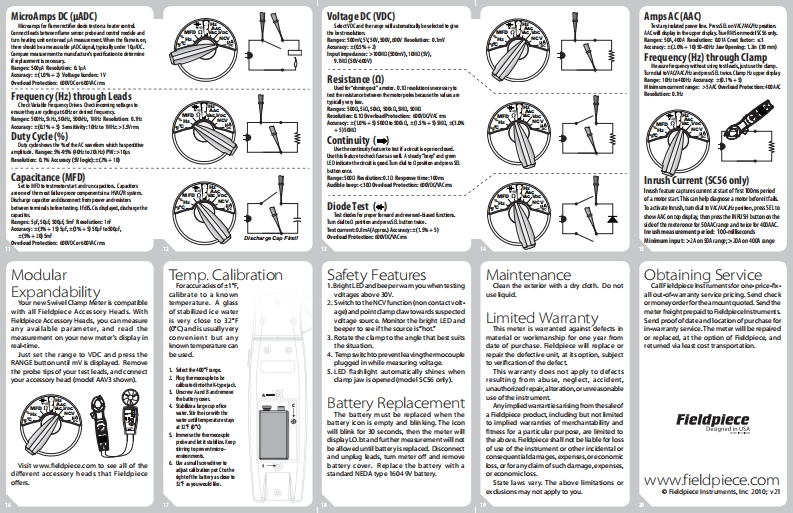 FieldpieceQuick StartDescriptionControlsDisplayL For doctical tasing,connoct test laads tooSC55a5Cg金awdd由o0Battary Life (eplace 9 7 blinking)COM"and""jade.Forempor urtesingAuto Power Of EnabledSwivelmove test lex出and slide T日P switch toThe swivel on the SC55/5C56 allows you toHigh Volnge Whming (30)tw fghtManal Range (RNG ModeClamp2.Fotane the dial to yourdesinod func tionPrs2e2908amData Hold Mode (Model SC55)至L cyde through th0amwtI1RSH Ineush Amgs Mode (ModdSC56theswich podtionCoevinuity TestMeterSC56 ako contin the functions that ane mo3 Conectto tstpointsand nadme aounmentelevant for an HVAC/RdheidhnRotte dal to the function youwant to uie.Diod eTastOPERATOR'SondphyThe unique cirouit allows亿Froquency Test (hortz)the SC555C56 to gt accute tempratuMANUAL0经t0 cyde through四am08sRedistnoe Test (ohed)wthin a dial positonFModdis SC55 SC56Certificationsalows you tocalbrane the tmprtunonyourc①⊙Presstoillumim t badlight for60 sec中Vico Unit (o,one milloeh)UL 61010-1,SecondEdifonMili Un (104,one thousandh)LETEDlnrush curant (SC56)alllows you to got aPrss to activax Inrush currentGlb Unit (10,one thousnd)ceIEC/EN61010-1wbl00 mant ofa mo0/s中papcaptu mode (SC561MegaUnit (10,one milior)IEC/EN61010-2-082draw.Tou can ue he inruh mounmant toEMC EN6I36w中d3g0 se a mo0 bofone t fals.@gThejw light (SC56)and bacight((5C56)C-Tick(N22675)make it easier to use in any ighing condtion88☒●IHRUSH特WE正vdh9 adings on vor自ble fhquancy山wsCATII 600%dass I and polluion degree 28888ndoor use comply with正,RoHS complinntm卡MKBHzSafety InformationpecificationsFunctionsNover ground yourselfwhentaking decricalNpair.Donot use duing dlctrc somSpec0 rangi.位as山Temperature (F/Qmeapunmnts DonottouchexgposedmetalDo rotapplymonthan mtedvolngisbetwon月gr商笔诺作ga日Wm山与r化卡W能ttgWipw鲜aue气xuw鲜感which might beouraert s小spirceedronimlinput and ground.I收Atant业at ground ponnal,whie taking maaaure.Isol te capadnoes fhom sam and dischargdmnts.Kop yourbodyisol d ffom ground中am saly befone tasting山t士与by using dry dothing,nbber shoes,rubbarA voltage tests:All voltage rangs willoage brmp时au作s14听-rTe面件,0ew州年山tion wdticefo c山bok档un车听e室i,NYe0M后fmatsorany approved ingulaing mal.witstand upto600 Do notapplymorethanDisconnoct the testleads befone opaning the0+1个e401,(N9元e1自rxe用,1Yeg(单年eUw=0w+州-Te气=0+10气inlation or oposedwin.Riplaceifsspect■Caution,线ofelectic shockA0(Aur0A年aCnm金i0W分边下e皇元,0W归位光er光Kesp yourfnges bohindthefngergundson△Caution,rdfertomannl.e家全ckstrdd fol betes NE花然,居正线,ECef四teno边s whil taking measuamen盛Ground3与:途ousteiclalle四条1金ustydiclWhandisconncting fomacro.t,diconnct四Double insuh fonadro年Lar bat2 yindicatorc Bateyicceblis and气0业r'sthd中Non Contact Voltage (NCV)t"REDTeadfrs,nthcommon'BLACgtd.指的ac箱inom ha suorbda年Ahwork with othe区AWARNINGS年高nrta中wishor n金yef保de明t城过Ae正D.Turn off power to thecirout under test bo60oID比区T正肠量awepiring0hodp2ct置a红Mrm ur lesofewheESTNY ANCI0的0的OL能E上dadroitVoltage AC (VAC)(50Hz-500Hz)-Donotmeaounsitance(ohe)whendrotch与ua江年的hm1,4d过车edris powered bolane load by disconncting8OE H HE0CDU