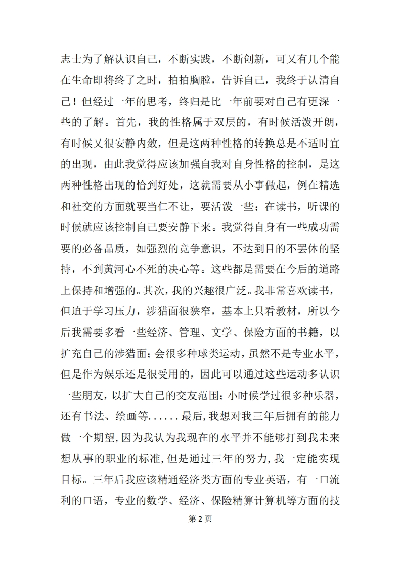 职业生涯规划书一、职业规划对自我的意义从专业角度来看,职业生涯规划是指个人与组织相结合,在对一个人职业生涯的主客观条件进行测定、分析、总结的基础上,对自己的兴趣、爱好、能力、特点进行综合分析与权衡,结合时代特点,根据自己的职业倾向,确定其最佳的职业奋斗目标,并为实现这一目标做出行之有效的安排。职业设计的目的绝不仅是帮助个人按照自己的资历条件找到一份合适的工作,达到与实现个人目标,更重要的是帮助个人真正了解自己,为自己定下事业大计,筹划未来,拟定一生的发展方向,根据主客观条件设计出合理且可行的职业生涯发展方向。于我自身而言,职业生涯规划就是有计划的规划自己的未来,一步一个脚印的去实现自己的职业理想。学习了职业生涯规划,让我更加清晰的认清了自己的发展方向,让我更加明白这条路该如何走。二、自我分析记得高中时老师就告诉我们要认识自己,“认识自己”,仅仅四个字,实践起来是何等的艰难,古往今来那么多仁人第1页