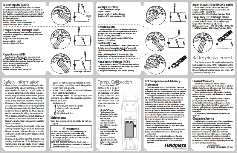 FieldpieceQuick StartDescriptionControlsDisplayReceivea Wireless ReadingAs a proud owner of the first wirelessFieldpicoe chmp moer,SC57,you ae well on宝Wirdess conWirelessL Selct RECVon mindill of SC57.your way toelmina ting tngled wines.SC57wil2 HoldSYNC for one second9 eyou the pow量0 rive m8n6Pamem indica or when sending aSwivel3 Connect Fididpioce accessory hedtoET2W.wirdesdy from anywhene on the jobste For1Tum可2 W to DC swinch positioninstanc&you can tarmt indoor wet bulb恒Bamtary Life hdicatorClamp4 Hold SYNC on ET2W for one second.Whanmasunmentsfor targot superhantovrtheairAuto Powor O道Sabldconnoction is made the windess noa ding andwhile youwork at the condener.High口g0 hming+3MMetercons wil disphy an te SC57 soronYour SC57 can Nceive measurementsHOLD Data HoldModewirelessy ffom ary Fididpioce accessory haadMAX Mxximum RaadngOPERATOR'SCertificationsNike an ET2W or BH4W.Your SC57 coms withMANUALQeET卫W wirdess2i■H在Frquancy T0e回UL 61010-1,Second EdifionReh由noe Test (ohModd SC57①mIn addition,you SC57 can tarsmitwirelesslyRotte dal to the function youwant to use.ac∈IEC/EN6I010 LEMCEN613261wineless Nodivee ike BH4W HG3,Ln7AW ar⊙Hold for Isecand to connctwitMico Unit (o,one millionh)EC/EN61010-2-082angher SC57ather Fieldpiece winlss productsmMili Unz (10"one thousand)SC57 i a swivd damp meer designed forFCFCCID:VEARP955Athe HVAC/R techeician The swivel on the⊙Cyde through p四a减tsta9NsSC57 alows youtosee the amperge rading.wthin a di positonC-Tick0N2267司of wire ariantation.The jaw lightand bockightmake it easior to use in ary⊙Presstoilluminae badlight tor 3 minWE压lighting condition.True RMS helps you takeMAXMINHOLDmore acourate voltage readings on variableCATII 600%dass I and polluion degee 2spied diws@minimumNadingHzμFAmWF'C DCACindoor use comply with CE,RoHS compliantSpecificationsFunctionsWirelessAuto-Connectionrading to the windess civer in your handWhen powered on SC57 will search anddhp道当mnu触aoidi mpairin甲w奇情由道rn家华toSft因上ad实Wireless Receiver Mode随nin us wirele通nee1fct申d或Sending Wiseless Measurementsconect to the last coneected single-linkof the pro duct.W由省rgn可-古花地e型0出n,左名出eLke your SC57 to winelessly nceive a live1.Seloctany awitch positonoter thon RECVMnhs丝oorter devio.measungment you have set up at a difeent2.HoldSYNCunti merbesps(l Searchigh学就ICceurt dplyy sth bid业oca tion on the jdb sie.Lke rooeiving anindoorpamm wil nisteTemperature(F/Osting-erh山d3.Sdect RECVawitch poitionon the FaldpicoeRecdiving Wiseless Measurementswireless over Hold STNC bumon for one,gpat.ce undian h leced micethemterd。山nd与山山由酶金r年上hdr中士如式L Sdect RECV switch posiion on SC57.Hold山t士内4.The ffom the SC57 wil beage ba时au行e14吓-rTe面9,0eEw创o信enrt自widisphyedon te FeldpidowidessNoive.ng事4Teur下,光e1r0 soludach上tt线2 Comect and tum on anyFieldpioacoessoryhado中eE卫W wides tardmt01下e,044ele prrabuntcoffden1a年过ndactr动wTR光e)-40CI0OY10下xe吊.,1egC拿平w1世W3SdectDC swixch poriionon ET2Wforallacoes.0分宝下e立,+9teu证气sory headks exoptACH4 (AC swinch posion)水g脑区t由4 Hold S'YNC bumon on ET2Wfor one sec