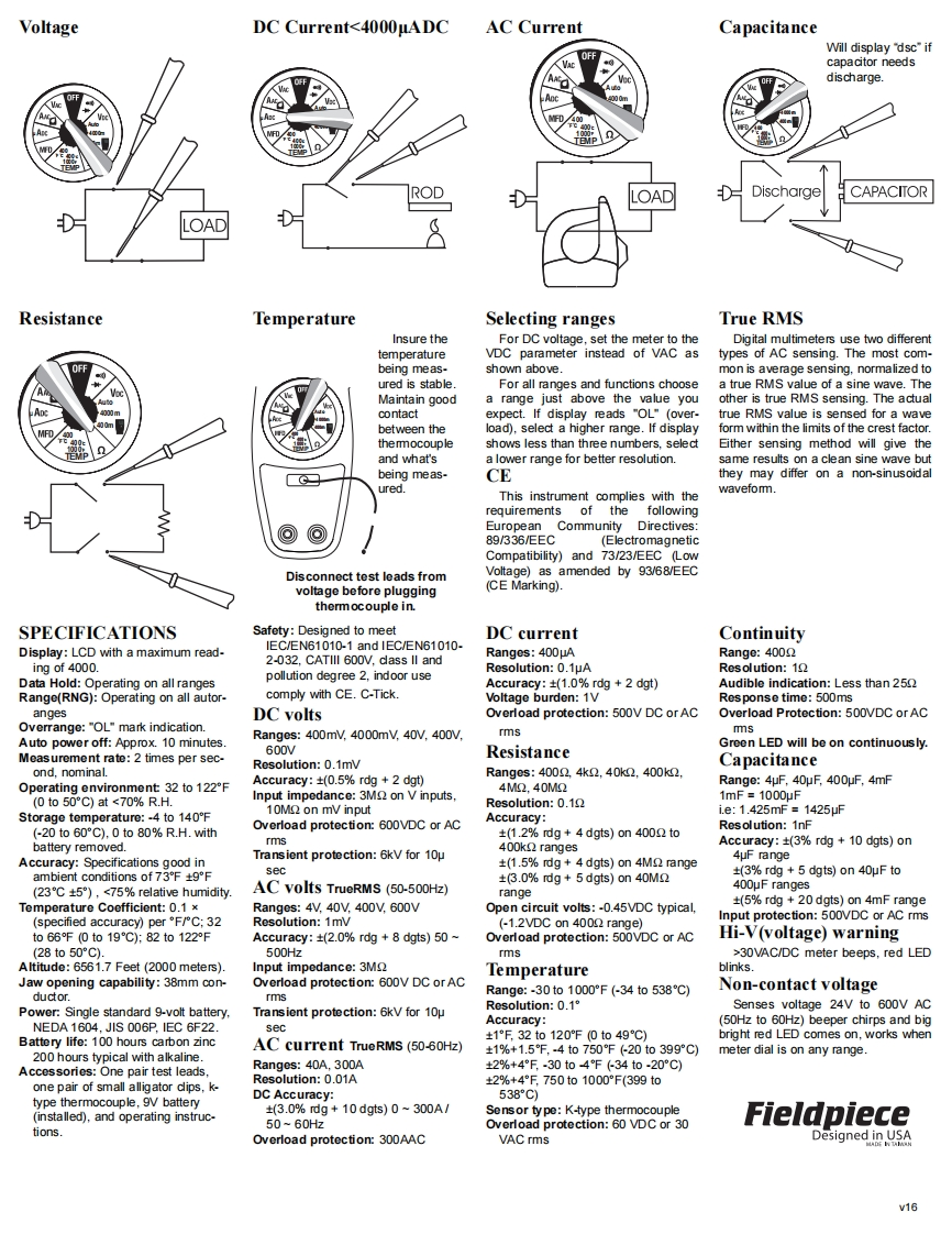 AUTO RANGING T-RMS△WARNINGS△For your safety...Limited warrantyDIGITAL CLAMP METERDISCONNECT AND UNPLUG TESTGeneral:Disconnect the test leadsThis meter is warranted againstModel SC77LEADS before opening case.before opening the case.Inspect thedefects in material or workmanship forTEST NCV FUNCTION ON KNOWNtest leads for damage to the insulationone years from date of purchase.LIVE WIRE before using.or exposed metal.Replace if suspect.Fieldpiece will replace or repair theDO NOT APPLY_VOLTAGE greaterNever ground yourself when takingdefective unit.at its option.subject tothan 30VAC or 60VDC to the thermocouelectrical measurements.Do not touchverification of the defect.orthe jack wen the rotry diaisonexposed metal pipes,outlets,fixtures.This warranty does not apply toREMOVE THE THERMOCOUPLEetc.,which might be at ground poten-defects resulting from abuse,neglect.when taking voltage measurements.tial.Keep your body isolated fromaccident,unauthorized repair,alter-DISCONNECT THE TEST LEADSground by using dry clothing,rubberation,or unreasonable use of thewhen taking temperature measure-shoes,rubber mats,or any approvedinstrument.mentsinsulating material.When disconnect-88DO NOT APPLY VOLTAGE TO THEAmy implied warranties arising fromJACKS when the rotary dial is oning from a circuit,disconnect thethe sale of a Fieldpiece product.microamps.Even low voltages can cause"RED"lead first,then the commonincluding but not limited to implied war-88a current overload and potentially dam-lead.Work with others.Use one handranties of merchantability and fitnessWorks withage the circuit.for testing.Tum off power to the circuitfor a particular purpose,are limited toFieldpieceunder test before cutting,unsoldering.the above.Fieldpiece shall not beor breaking the circuit.Keep your fin-accessoryMaintenancegers behind the finger guards on theliable for loss of use of the instrumentheads!Clean the exterior with clean dryprobes.Do not measure resistanceor other incidental or consequentialcloth.Do not use liquid.when circuit is powered.Do not applydamages,expenses,or economic loss,Battery replacement:When themore than rated voltage between inputor for any claim of such damage,multimeter displays""the batteryand ground.expenses,or economic loss.must be replaced.Disconnect andAll voltage tests:For model SC77State laws vary.The above limita-unplug leads,turn meter off.andall voltage ranges will withstand up totions or exdusions may not apply toremove the battery cover.Replace theyou.四气PA600VDC or 600VAC rms.Do not applymore than 600VDC or 600VAC rms.品battery with a NEDA type 1604 9V bat-Obtaining servicetery.AC tests:Disconnect the meterReturn any defective SC77 tofrom the circuit before turning any6Symbols used:Fieldpiece for service.For warrantyinductor off,induding motors,transservice,please provide a proof of pur-Caution,risk of electric shockformers,and solenoids.High voltagechase.Contact Fieldpiece for out oftransients can damage the meterwarranty repair charges.Contact infor-C