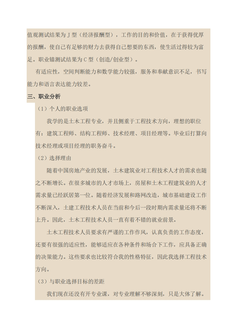 土木工程专业职业规划书班级:姓名:学号:一、前言莎士比亚曾说过:“人生就是一部作品。谁有生活理想和实现的计划,谁就有好的情节和结尾,谁便能写得十分精彩和引人注目。”驻足观望,电子、网络铺天盖地,知识信息飞速发展,科技浪潮源源不绝,人才竞争日益激烈,形形色色人物竞赴出场,不禁感叹,这世界变化好快。在机遇与挑战粉墨登场的未来社会里,我究竟该扮演如何一个角色呢?水无点滴量的积累,难成大江河。人无点滴量的积累,难成大气候。没有兢兢业业的辛苦付出,哪里来甘甜欢畅的成功的喜悦?没有勤勤恳恳的刻苦钻研,哪里来震撼人心的累累硕果?只有付出,才能有收获。未来,掌握在自己手中。二、自我分析古语云:“金无足赤,人无完人。”每个人都有自己的优点和缺点,世上并不存在尽善尽美的人。要想做好职业生涯规划,首先要认清自己,包括性格、爱好、言行等等。这样才能扬其长,避其短,才能更好的面对人生。经过霍兰德职业兴趣测试结果,我属于R(实用型)型,DISC行为方式测试结果为D(支配型),行为方式可用如下词汇描述:好胜、大胆、进取、创新、独立、敏捷、直接、强硬、爱冒险、敢于竞争。职业价