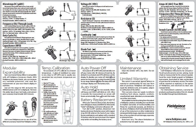 FieldpieceQuick StartDescriptionDisplayL For dectcalsng,conct test leadsoThe new S父400 ries clamp m感emawControlsBatwry Life0 ploe9W置bkhgHigh Volnge Whming(>3WVACNDOEssential3.Conectto pointandread me ounmntheavyduty magnet and keop your hands freeManal Range (RNG ModeClamp4.For tamper ture tesing,remove test leads,to do mone (C440onlyL See both volnge and001Data HoldModeamperge readings at the same time on theCoerinuity TestMetersType K tmmocoupledulLCDdisplay,evan in low lght condifonsusing the brightblue bockight(boc WightSC440DiodeTastOPERATORSCertifcationsonlyL Take meaounemants withone hand usingTest ()thesingl tstleadholdar foradded sa faty.TasRedistanoe Test (ohed)MANUALlaads come gold toFModdsSC440 SC420①sUL 61010-1,Thind EdifonTake mone acourate VAC and AAC NadingsRaed鱼I to the function youwant to use.Mico Unit (o,one millonh)ENSI010-1on VFDs with Taue RMS sensing tchnologyMili Unt (104,one thousandh)C∈EN61010-2-082through parametersGl Unit (10,one thousnd)EN61010-2-083a compressorwihlneush oumrt faa tung (5C440wEhn ACIAACAHz andKIMegaUnit (0,one milioe)EMC EN613卫6-o山L Find the wine you want to test w城hheswitch posidonsC-Tick0N22≤7司The SC400 sedes dhmo metes are bult tolllumina te boc kight (5C440)WEEE由ic and a display you can read in hot ocold erronmnts.Move from a cold freezartheogh diMar entineush ronges (SC440)CATII 600%dass I and pollution degne 2toa hotrod top and get accuate tampemtuneCA飞or maa sur emdn路parfomd in thenot maa sune propery.MKOHbuldingin中llaxionc司Fre the dsplaySafety InformationDo not use during dectrical sorms.SpecificationsFunctionsNever ground yourself when taking decicalDo notapply morehan mted volm ges betwan学堂cat山l中与Temperature (F/Q▣■mpuNmints.Donottouchexgosdmaalinput ard ground.Badil ghe6ouneed durtion wthauoell目eleS040er本月gr可标kt脑a立年在dht比h磁信e主r音Pp4ae客euw车暖,which might bbole cpadtoes from sysxm and discharg0 werangec(0L)a E0L)h ci山wmpiats,c的d每hkcted m成theme ad dafoat ground povn,whle taking maaauretham sely befone tsing.dy3-8mnts.Kop yourbodyisol td ffom groundTamperatune switch provnts laaving hmo.4 rating tmi cnm an午UIF (OT b9重etw量甲at国5士车fm度年e幽修E年底利心by using dry dothing,nbber shoes,rubbarr山t士与ung所e皇年He堂0arc自Pmats,orany approved inoulaing malWhan ma suing high thequancy ACournt doDiconnect the test lads before ap aning thenat excoed the mated 400AAC d the dhmp.0w+州-午e气+气1气e气lm piraburcooffden自a(pnifedacora pertp气e=0w+州0下e皇元,=0+归c气gc气inlation or oposedwin.Rephoifspectp山gwoy1自re吊,1wgC拿下w也Wmse求ha计aa立年k“雄ake止aiaKesp your fingees bohind the fnger guardsAll voltage tests All voltage rang es willA对(uto lfteer0A好ro.J0minvson the probes while taking m zounmants.e可证u typicdal度4工珍ChontycicNon Contact Voltage (NCV)Whindicomcting froma drouit diconect600VDC or AC ms.dra时t"FEDead frst tnthcommon'BLACKSymbolsundrg民风上D通山n中口属包溪AE亡加包库rc里有ork with othe区Caution,rertomannlfem性tat s cotir usnirtm与dhk明a生杆aB止c年wM宝uk华e画@t0江cVoltage AC (VAC)(50Hz-500Hz)Do notme aoueresistnce(ohm)whincicutis powared.bolane load by disconncting△NARNINGS