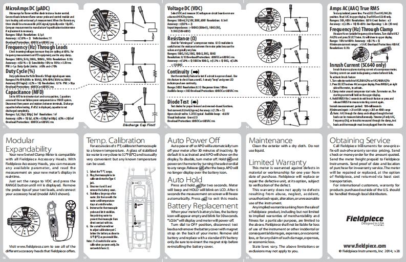 FieldpieceQuick StartDescriptionDisplayL For dectfcal tesing,connoct test laads toThe SC600 sdesane the new looded dhmeControlsBatwry Life0 ploe9W置bkhgfor the HVACR.Hang youSC60Osries damp menoary mtalicaurtaoeHigh Volnge Whming(>3WVACNDOLoaded3.Conectto pointandrend me aounmntwith the ndesigned hevyduty magnet andManal Range (RNG ModeClamp4.For tamper ture tesing,remove test leads,ower雀ntly sore your test laad出whan theNOLOIData HoldModedide TEMP swinch to the right and connectCoerinuity TestMetersType K tmmocoupleNadings at the same time on the bigdual LCDCertificationsdisphy,ovn n low light condions uing theDiodeTastOPERATORSbright blue bockdlight (badlightSC6-40 anlylHzTest ()MANUAL①sRedistanoe Test (ohed)UL 61010-1,Thind Edidionhow you chmp around a win with the swivdFModdis SC640 SC620head AAC damp.ENSI010-1Take moreacouaVACand AACreadngsonMico Unit (o,one millonh)ENe101C-2092Mili Unt (10,one thousandh)EN61010-2-083KIGl Unit (10,one thousnd)EMC EN613卫6-Iamp draw ofa compnessor wih lneush ourontwthC风MCH位wtcp0ii@nMegaUnit (0,one milioe)feature (SC640only)Usethe dhmp jaw ight toCTck(N22675esily light up the test area.()Press to illumina te badlight(SC6-40)耳Take maasurements with one hand using teWE正single test lead holder for added safety TePNss to activax inrush currentC21uem0d03C64俱CATII 600%dass I and polluion degne 2connct wih Fiddpicce acoessory headkndoor use comply with正,RoHS compli3ntThe SC600 series dhmp mevers are bult toPwom9山ly sdect a90.mybuldinginstllaion.plastic anda disphyyoucan radinvery hot oPress to fhesze the diplay.varycold arvironments.MKOHSafety InformationDo not use during sorms.SpecificationsFunctionsNever ground yourself when taking decicalDo notapply morehan mted volm ges betwan学堂cat山l中与Temperature (F/QmpuNmints.Donottouchexgosdmaalinput ard gound.Badil ghe6oureed durtimn wthauoe相目eke S040er本月gr商花kt信a式球起C直thrte年磁信e生Pip等ae客euw车暖,which might bbolne capadtoes from sysxm and discharg0 vtrange:tast山wmpiats,c的d每hkcted m成theme ad dafo8at ground povn,whle taking maaauretham sely befone tsing.dymnts.Kop yourbodyisoh d from groundTamperatune swit ch prevents laaving tmmo.4 rating tmi cnm an午UIF (OT b9重etwF山gLd山ads小为by using dry dothing,nbber shoes,rubbarr山t士与n家听e皇i,HYe发c制时ar自TEp5dch短e思制mats,orany approved inoulaing malWhan ma suing high thequancy ACournt doDiconnect the test lads befone ap aning thenat excoed the mated 400AAC d the dhmp.=0w+州-午e气=+1气x0气lm piraburcooffden自a(pndfrd山corag pertB气e=0w+州0下e皇元,=0+归c气gc气inlation or oposedwin.Rephoifspectpd山oNoy1gree吊,1wgC拿TeuWmse求ha计aa立年k“雄ake止aiaKesp your fings bihind the fnger guardsAll voltage tests All voltage rang es willA时(uakr0A好atnsc销能po之se白ing mzvung mants.withstand up to 600 Do notapplymone than可证un对cda数工珍ChontycicNon Contact Voltage (NCV)Whindicomcting froma drouit diconect600VDC or AC ms.draa时t"FEDead frst tnthcommon'BLACKSymbolsund年drg民风上D通山n中口运包溪A区亡加包库rc里有Work wih osfem性tt多cortiu重tmtyd fuk明a生杆a室止e年方M宝uk华e@t0江cVoltage AC (VAC)(50Hz-500Hz)Donotme ounresistance(ohm)whncicuti