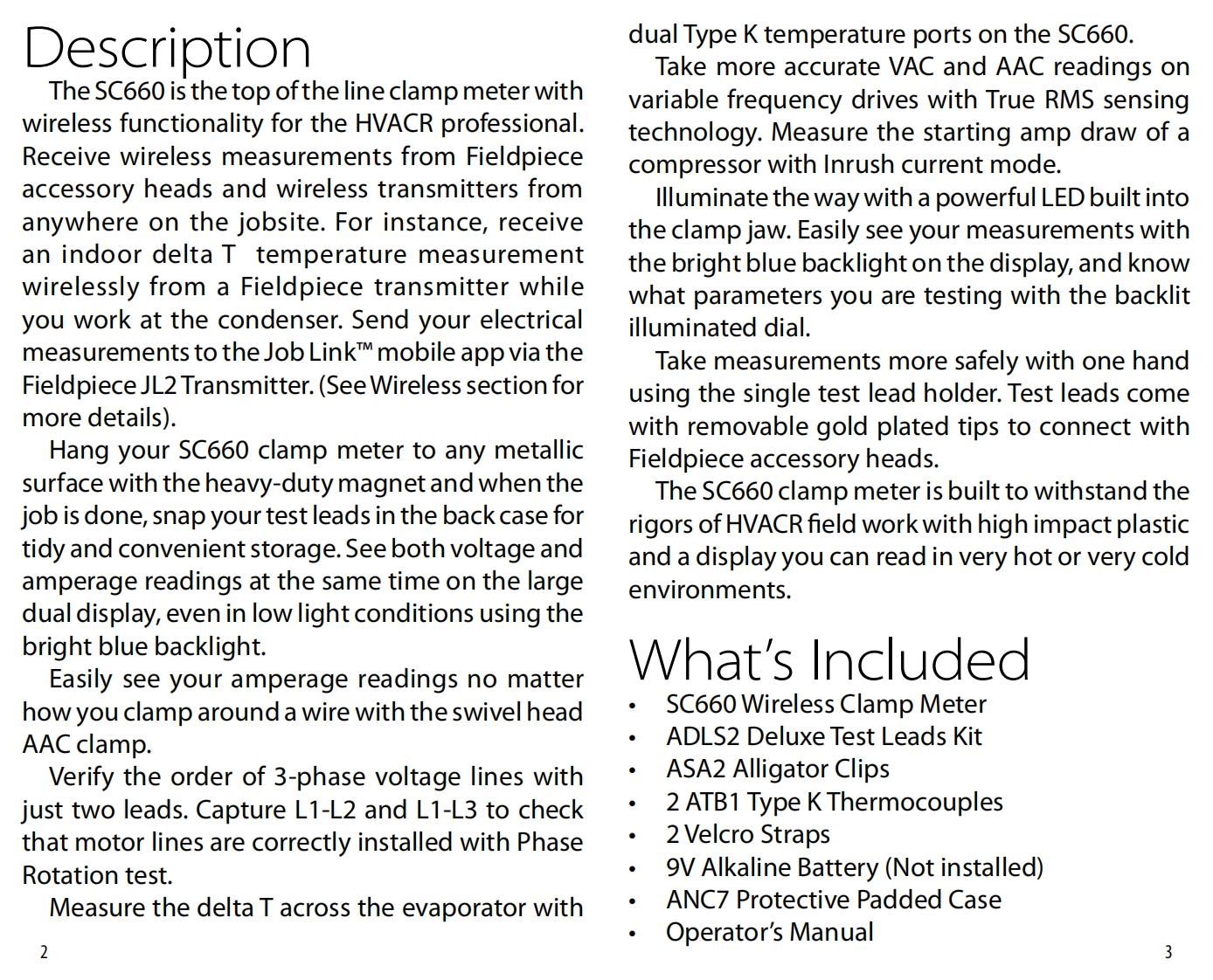 使用操作说明书手册-SC660-v14348072@abc4个月前发布关注私信8.06MB16页038使用操作说明书手册-SC660-v14此内容为付费资源,请付费后查看¥16¥23黄金会员免费钻石会员免费立即购买您当前未登录!建议登陆后购买,可保存购买订单付费资源 第1页 / 共16页 第2页 / 共16页 试读已结束,还剩14页,您可下载完整版后进行离线阅读 THE END说明书手册 文本预览 FieldpieceWirelessClampMeterOPERATOR'SMANUALFieldpieceModel SC660OFFNCVAcMFDRECVADc%SyncERO ADCRangeSelectH/MW/m5C6600BB8T1 T2DCT1-2HOLDMAX MIN MKOHzTRUE RMSAUTO OFF且VMx2CAT 查看更多 收起部分 喜欢就支持一下吧收藏
