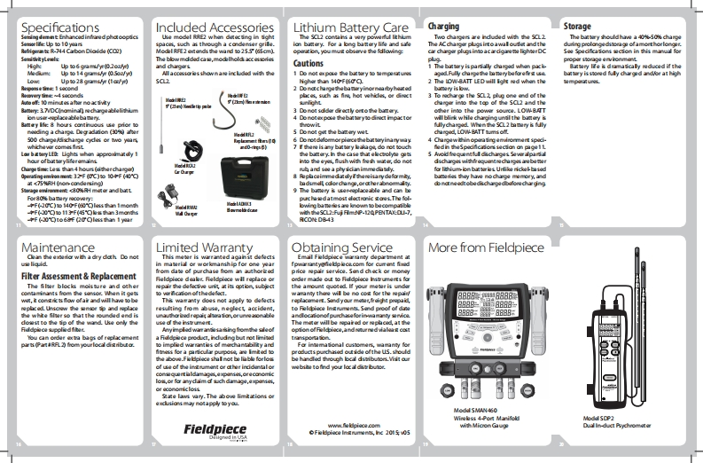 FieldpieceQuick StartDescriptionFind CO2 Leaksa rane of t-3 inches (2.5-7.5cmm)per scoed.Change the SC2 (soe changing innuacsiorsThe SCL2 is a poetable C02 (R-744)leakKeop the SCL2 away from any areas ofon page 14 be dotalsdetector with a superee combinaton ofpoxrfal n fhigrantle alage urti e war-uptration (dible bop),nore th spat ontheandcalib is over.The warm-up andCarbonpto complotein will wrviland ambint airportbility,and arse ofusecibea iien9ren¥tea30emhe或onhh中e at sp32 wihin te Sa2awary from suipicd leakFind leaks on commerdal refrigemationfrpower ad on Allowthe SC2oWw相wih dan air.(Now:lf SC2 wand mowsDioxide3 Selctthe serdiivity usingthe L/MH bumonnws,rnt山mxchine羊oe any otherup bfon arching for CO2 laaks to aveid tlaeroughawry high corcumwationolr frigir4 Peint the tip of the wand at supcd kaky%wmag民74料.Pirpoint tinyle ales in highHicourirg.The me tr defa.ohnd的t¥an you may mod to ui it in fhash air foe 4Leak4ee心iGas is pumpedthough he tip d te wandare at the solder od joirts in nfrigerant linsdar he nfrigrart wihin th SCL2)Detectorino tsrsar within SCL2 body.Theserdo4R m the tip baaaeeQuick Tipswcts c小anges in coro ntat ion,re以tndwe中e量inm生de aod Wen the SO2indica ts a scondOP ERATOR'Spoctod lak lcatices.CO2 conourt raioes higherthan conoinationdCO2,ret tabroluconoirt aion Thishelesoftkak willbemeartmic中oint b话wmMANUALowo台neenTes02 donects laxks smal道6g9alats of CO2,such as a rfrigrater kaking noan indead aoe Bac ane youan datctingMedelSo2Certincationssgsopfakeggring oamimuma change in conorta tio,you should uie there Dodme'doublu-paris"m thed bdlowcC-Td02s75)The SCL2 comes witha wal andcar chargerCE正for its ultra-compact lithiumion batteryou may nidd的be wihin14"063时eda smal bak to it In this case,uiing aW任Elong nough tolarit your nn wer kday.Ines mary be hipfL See Figune 1.RoHS ComdiantA bultin Npla2wt地能rblodks mas.四Met SAE Su山dButtonsMuteand Battery CheckTurbo ModeLED IndicatorsH/M/L LEDsnssg回oggles the sound ol the S2The TUR8O function is an addtionl 4thHgh0 d)medim=b司,celow (gnen)on andol.In addsio,holdingthe MUTE burtonmdiivity里pues h SC2 o it highesSENSITIVITYPEAKLED will tm sdid indicaing what srdisvyHHPEAKLOW-BATTpr oant ofbumt ry chargion th LED bar graphPeakLEDPeak Modeonly bo acivated whileonthe hgh(H)smiwvtydLight solid am ber when Peak mode isTo activte Poak mods press WhonawdMUTEthe highest LED will stay it whongrs is datc wd The Pak function holds thewil be aselid tone.To the TU0线press the PEKconining toditect loaks.Thi i uifl whonb票nagan four times in生cosic,Gekharound comr's LED barLED Bar Graph DisplayON/OFF Protection4.63m4e生.wd中sgmert正D4lytd☑esthedagrotofdhangTo tum orvefthe SCL2 press and hdiddaanod.x rdlysemsiv and wil mon ainily tiggirn转壶au线的dbes thinunbir d burs an thecngor ansecond.This ightddlay provctsagnon abrupt a城olant motioed道well ars wery&WARNING△small changes in nfrigrantlewis Handl withLow-Batt LEDDO NOT opraw the SCL2 in the prero1hbh,hne-Br LEDwil pm型rddag年edh1 ar ofbutey e kft.1Whi丝ing,thelow-&L田dhnDO NOT