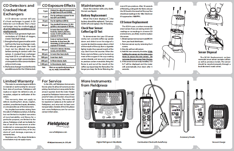 FieldpieceQuick StartDescriptionPrecautionsl.由19battry lcatad的thebThe SCM4 standalone cabonL Donotmaasugx engndehaustar other high COor highlycontamWARNING△Carbon Monoxide2.Pr ON/OFF for Isecondtop owrmonooide in parts per million (ppm.)mxdg9生.High kvels of C0andDetectoron the SCM4in a rominal CO anviItis in tand ed to measune leveldhtG0白ants can min theronmntsuch asoudooe.adCo的ill2 m biant air.The monor and be a heath hzardOPERATORSNo:10 socond wam up mspmcical application of the SCM4 is2 Do not take nadings dinectly in3.世00%M正0wHeQto datermine if the indoor COlavelsamof airat rogisor or n a fue.CAUTION AMANUALdooes to setthe ambiant CO ppmane higher thon oundoorlevel andto王ownough timforSC4ed小4.Carbonmonoddid(Ca abovenomidetmine he souroe.In mary casesambient tmper tune and %RH.Moddnallevels will be disphyed in partsit can hdlplocte a souce d Co4 The seesor has bultin pormanantSCMpor mllion (ppm)The5dM4usa白t reacingron-eeplaceable to out5.Pr ON/OFF for Isecondtop owoM.coume dmicakandanexly bend mosthydrcc arbor量podf.白ru.replaoedin the fdidifnoded Seroeto high concantrations of hamulCertificationsof wpooune.el,or dirt,th0 rand城e0awC-Tid (N22675)andor impade dimunion d Co toh宝n址Ets每aeta年意tueat拉rr铺-置气线baicgn wrsas sh地E正k.能这m过海a自h量山线er与底u中成.RoHS Compliantntus d he出aDisplayHow to UseZero SetSpecificationsStorage6 nodad,如t0w3gto墨on"Walk Around"TestTo maintain sensor inegrity,doSemo Type:Elcroenicl年dkto通Atofeserorla known 20no C0第mophin andinaS4ab色Ficoryc baned运not sore in anas containing solventTheSCM4 Nespondsamostinstandympar aure similar to the sample aiapo至Ti出hd小uwso@kud8888to changesin CO levels in the aicIfto betesd.Zoro only whon ambiant孟ehrw气w相polish,windowyousoe a dimarance in COlevdis fromwt当oca06ande00D0道m0图如n5 minune eporurdae气nd all onganic solvroutside toinide youned to fed theiso urce of the CO.Walk around andh iwe humidity)wit ambianth道板wy●TTT☑%RH.8888wanch the dipl球To aro,hold the ZERO buttonBy constandy going towardks the多-10道em士%通山gmt年amaof higherconoematon,youcandisplayed Note For fraty asomCuNdavmine he souro ofthe CO.5CV4 willpotzoimadoa isangH能名hn%raPeri织ef0u0iC0,unas malfunctioning combustion0下9-onnn0acdo四a0羊n钢imt3数0D下00Controlslite theg anning09%RH,ndnd国h上年性dbrenw endtoWhen sandhing for souroes df CO,Sa求Emvironment3o6T000ur20%RH.ha宝yremoned formor anyone ake in danger of ercessiveorun to CO.Over egosure to CO2R0canhavelongoarmhoathomects andooclbucil时toedhples