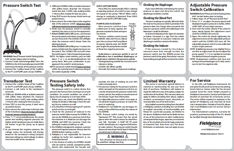 FieldpieceQuick StartDescriptionDisplayCorroct prespure swichoperation is inogralL Ress i forl socondto tumon your SDMN6.士a,aThe SDMN6 is a dul-port manometer thatDual Port2【waa%pw备ZE0 for I second to sot thalso acoumtdy tests prssune switches by居年侧H回Manometerambiant prosune of Pl and P2.m血gad妇twih aninmal pum单and PressureAdjustthepump's ed于幽t3 Pl wil be dsplaydnindhs ofwaxr columnprespu vaouumLThe redLEDindicnswhnoais Cortmtyda铺你t信门g以P1Switch Tester8888(C)P1-P2 willl be disphyod on lowor line.the swinch doses.Vew the c sng/openingP2888pressunes drecfy an he LCD4 See sconss bdlowfordetals on tsing presThe du-port manometer measuns 460OPERATORSControlsMANUALChock building prespurization wih staticaw性mdre dla.cm南H0DScn torVidioprespue resoltion of 0.0TWC.View Pl-P2Modd▣in the botom line of the display be dhedingieand rt epressune diMarenfak.Helefa aresecene le aea年do面anpt松r单SOMN6eth年4E■t南e门府这6CertificationsUdte盆c presure pro边s to dhedk fora pressure drop acooss two points in a ductUC-Tick (N22675)Thi i utul for evaluting a blower or fndingn色1安名四年peQ比储the rd.onv om.(HdercrorneerC€aWE正剑t,城,a时.化cddw证a)国n士年动RoHS CompliantSpecificationsStatic PressureNOTE:Gas Pressure1.See manufxctunet's for targotng anvironm at:业下TIEF (Ot b整9kxwL ZERO yourSDMN6 while at ambientpressurewdg中cpressure ofanaifow0aminlot andoudetpressunsagNm时au年e14所teE90e置%州hbta)rcw尊wth any hoses/ordbes amtaddThis will xroNOTE:The nad arrows on the prdb es should2.Shut ofma的g6py0ce乐W,A能人区且能1Wu上at雀成bot Pl andP2.For meaounmertsless than3.Shut off power tofurnoce equipmant2 inC,talke reading wthin I minue afr4.Zero your SDMN6 while atambient pressune1非asmd在5绿九Nt年年Lcxroing for best acouracyA桥00NT0N3=wthhoses afaddaune nhive to the ambiant or ZERO prsune.thebrass soewfring of the Pl hoce inon,,t3 Correct boh hores I you want to see rela4.Youcan pr Pl /P2to toggl the top diplay01 preune tap0th09Keg里eEs时ar0MCive pressun,Pl.P2.This common whanbetwenPl and P2.No Pl P2 shownGas0 rangi:OL'c0正stdvaluingequipmant such as a blower.in the bomom ind of te LCD.inxad ofaninsentsorew.In his c Nmoahmu家拉tw们t4 ddrug vrx5.Pr UNITStoslect:indhesofw anrcolumnManifoldth0bra遥cnwfming fhom the Pl ho金andGnWQmilimewes ofwonercolumn (mWQconect the induded 5/16"adapter tubertu位1 xmedos0们,fa雀t业生s息mem的0.05xmilibor (mBar),or poundks per squane inchLoosen the tp sorewabout I Nvolution,and(prsilh0he边0 ovar the bo图作ilusyaion6.Your SDMN6 will tunom automicaly afreE相tat lt)Maike sune the tube is over the boss15 minutes of inacivty if APO is showna4n与t城wm细士d华To disable auopowrom (AFO)holdPl/P2fma女送ta山rcnar4守-9ma9t0e堂T0eu±LwF5(m anoBlowerwhile tuming an your SOMN6边信止细7.已yOu正inanerircemant wh0thew6/7ave fumace igine a:证ingit in normw:05er0rcH10e15w5ed1e±1堂qperatunis nofcaably changing whle you are0dd eureopmtonLt:±0心m红C5c生1山w5am生me±c给upionv7.Pl will showthe coming outofthet01e0r位e红性L形m0e江c003wconnct the meterfrom the hoses and ZEROregulrto.it neh ive to ambiert befone sach nading.the NgJa tor,connect Pl to inlettap and P2th0w9白aE