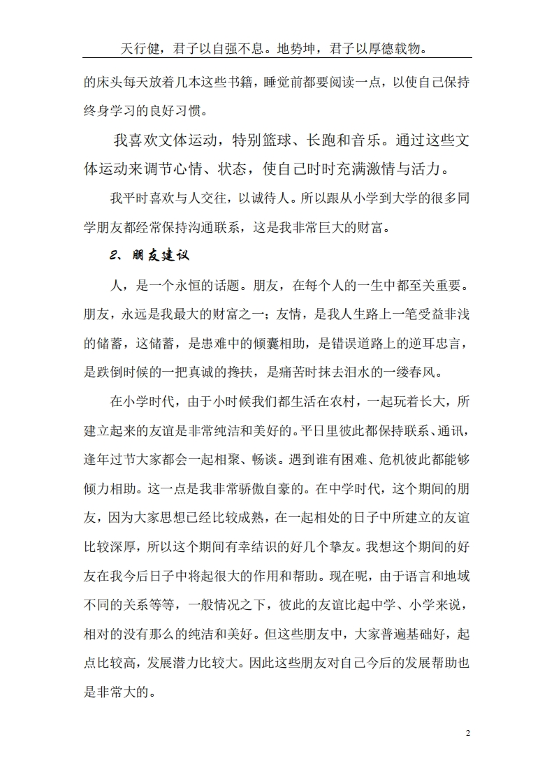 天行健,君子以自强不息。地势坤,君子以厚德载物。职业生涯规划书一、前言一个不能靠自己的能力改变命运的人,是不幸的,也是可怜的,因为这些人没有把命运掌握在自己的手中,反而成为命运的奴隶。而人的一生中究竟有多少个春秋,有多少事是值得回忆和纪念的。生命就像一张白纸,等待着我们去描绘,去谱写。作为当代大学生,若是带着一脸茫然,踏入这个拥挤的社会怎能满足社会的需要,使自己占有一席之地?因此,我试着为自己做一份有用的职业规划书,将自己的未来好好的设计一下。有了目标,才会有动力。二、自我认和及朋友建议1、自我认知我的控制欲强,希望控制生活与学习环境,喜欢别人按照自己的指示来行事,因此,有时会忽略其他人的感受;我很自信,喜欢显示自己的能力,显露自己的理念;我很乐观,常看到事情积极的一面;我身体素质很好,有冲劲,干劲十足,休息时间少,做事效率高。我渴望能力能受到肯定,有强烈的掌控支配欲,希望能享有不受拘束的发展空间。我有正确的世界观、人生观、价值观,并通过在大学的学习,使自己具备良好的的价值倾向。我平日喜欢阅读历史、人物传记、管理以及一些励志的书籍,我