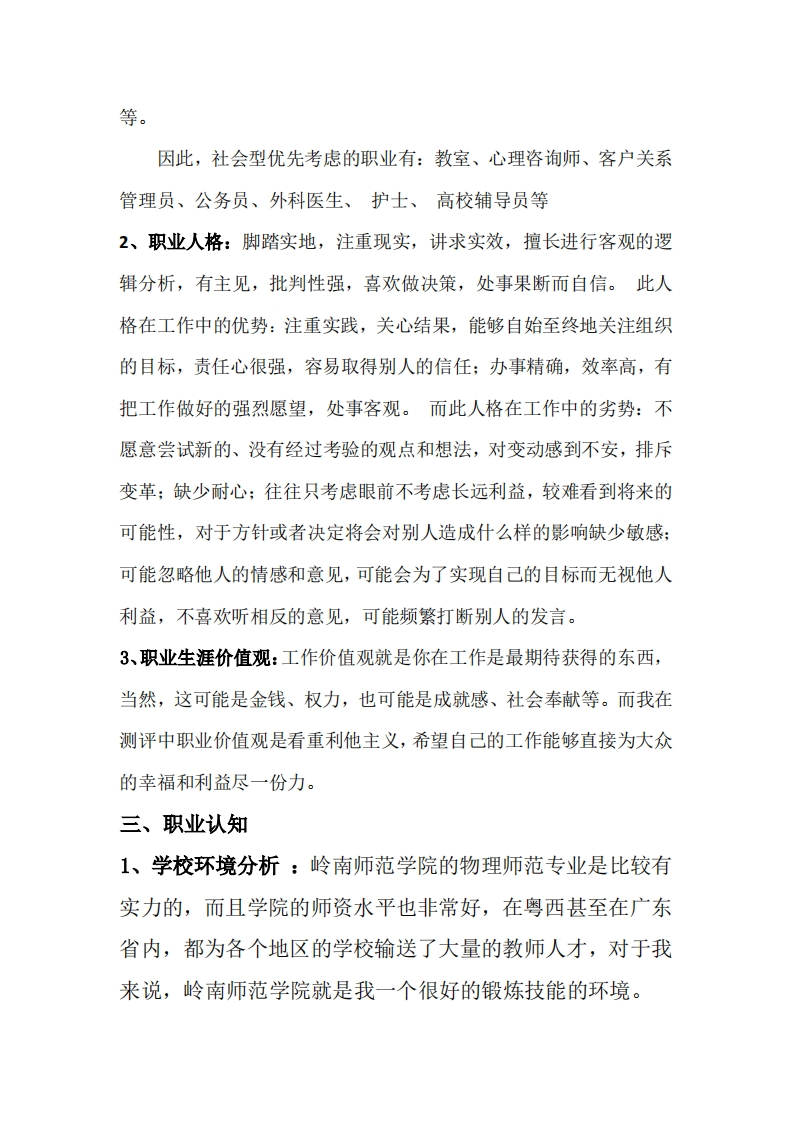 物理学专业职业生涯规划书一、引导语职业规划,是指组织或者个人把个人发展与组织发展相结合,对决定个人职业生涯的个人因素、组织因素和社会因素等进行分析,制定有关对个人一生中在事业发展上的战略设想与计划安排。虽然现在我们还是学生,但是现在及早做好职业生涯规划,可以为以后的职业发展打下基础。一个好的职业生涯规划不能过分理想化,应该从自身出发,立足社会。根据所学专业实事求是地确定目标,落实措施。我是一名物理师范专业的学生,专业的设定是让我日后能成为一名人民教师,而我本人也对教师这行业充满了期待。二、职业生涯测评1、职业兴趣:倾向于社会型。通过职业兴趣测试,我更倾向于从事社会型,社会型职业兴趣倾向的人,通常具备以下特征:(1)、关心社会的公平和正义,往往有较强的社会责任感和人道主义倾向:(2)、对人慷慨、仁慈,喜欢倾听和关心别人,能敏锐察觉别人的感受:(3)、个性温暖、友善,乐于助人,善言谈,能与周围的人融洽的相处,令人信服;(4)、在团体中,乐于与人合作,有责任感,不爱竞争;(5)、喜欢从事与人接触的活动,关心人胜于关心物。而适合社会型人的工作有环境:(1)、鼓励人和人之间的和谐相待、互相帮助、和睦相处;(2)、充满了有教无类的经验指导与交流、心理的沟通、灵性的扶持等,如提供信息、启迪、帮助、培训、开发或治疗等:(3)、强调人类的核心价值,如理想、仁慈、友善和慷慨