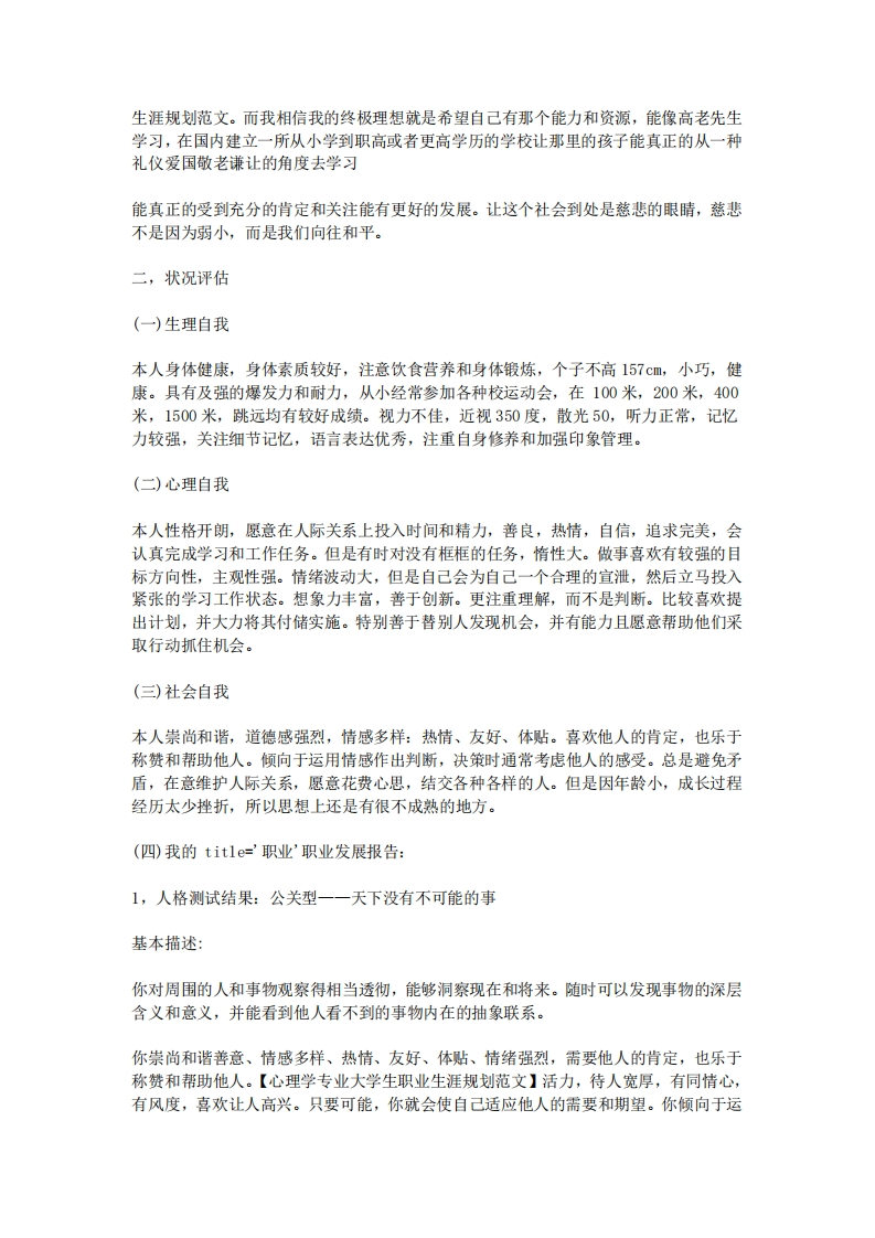 心理学专业大学生职业生涯规划范文一本书里这样说到:“一个不能靠自己的能力改变命运的人是不幸的,更是可怜的,因为这些人,没有把命运掌握在自己的手里,反而成为命运的奴隶。”我是从骨子里郡视这样的人的。人的一生短短数十个春秋,如果自己不努力下,拼搏下,创造下,到老了能有多少事值得自己去回忆去纪念呢?他不会因为碌碌无为而遗憾吗?记得一位哲人这样说过:“走好每一步,这就是你的人生。”人生之路说长也长,因为它是你一生意义的诠释:人生之路说短也短,因为你生活过的每一天都是你的人生。每个人都在设计自己的人生,都在实现自己的梦想。这里我不禁要思考,我的追求是什么?我该如何实现她呢?如今已经是大三的我,站在这个毕业的路口,该如何去面对或者选择我的未来之路呢?走老路吗?那里没有未来的召唤:走别人铺垫的路吗?那里必定有他们的误区:期待又一村的奇迹吗?那理想永远不会起步:闭着眼睛摸索吗?那你遇到的必然是无数次的没有结果的碰壁:那我该怎么办?明确自己的目标,规划好自己的计划,有的放矢。一,确立志向一-为营造和谐社会而奋斗终生戴高乐曾经说过:“眼睛所看到的地方就是你会到达的地方。伟人之所以伟大,是因为他们决心要做出伟大的事。”因此,要使自己的人生精彩些,首先应给自己一个明确的理想,它有足够的难度,但又有足够的吸引力。你愿意为此全力以赴,那么你就可能获得成功。正所谓:志不立,天下无可成之事,也才有“世上无难事,只怕有心人”的豪言壮志,理想是一个人行动的指南,那如果没有这个指南针呢?或许人生的航船就要失去方向了,而我,做为一名大三的学生了,更不能没有目标没有理想的生活。打小我的愿望就是能让贫困的人也能过上幸福的日子,那时侯不知道什么叫富有,就是想让那些一家4,5个娃娃,吃不饱饭的人能吃饱,能有漂亮的花衣服,或者也能像我这样口袋里有些零花钱,可以跑到小巷子里吃小吃。小时候的愿望就是这样简单。后来上了中学,真正的了解了希望工程,那时的自己又很关注在街头或者上门乞讨的老人,我想能不能自己有个大大的家,让这些老人全部住到那里,不要再费力的乞讨,或者不要那些苍老的不能再苍老的爷爷门去拉人力三轮车。后来爸爸说那叫敬老院。我想拥有自己的是义务的敬老院。上了大学,学习了心理学,教育学,看了很多心理教育学的案例,想起年年在电视媒体上报道的师生纠纷,那时真的希望自己能做一名好好教师,用自己的智慧和关爱教育好我的所有学生,让他们健康的生活,更完善的发展。一次偶然,听了台湾著名大教育家高震东先生来我们学校的演讲,感受很深,或者是被震惊了。突然感觉自己以前对教育的认识是那么浅薄肤浅。高老先生在台湾创办了忠信学校,他认为“德育是一切教育的根本,智育没有德育做基础,智育就是犯罪的帮凶:体育没有德育做基础,体育就是暴力的前卫:群育没有德育做基础群育就是社会动乱的根源:美育没有德育做基础,美育就是腐化的催化剂。”他一向认为:教育工作肩负在师范生身上,每个老师不能小看自己对学生的影响,“爱自己的孩子是人,爱别人的孩子是神”!对高老先生的崇拜一直到现在都没丝毫的改变。【心理学专业大学生职业生涯规划范文】心理学专业大学生职业