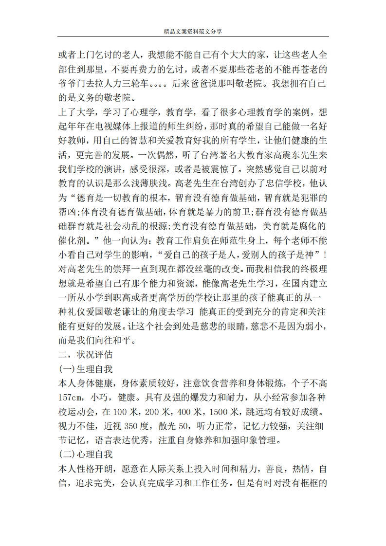 精品文案资料范文分享心理学专业职业生涯规划书心理学专业职业生涯规划书一本书里这样说到:“一个不能靠自己的能力改变命运的人是不幸的,更是可怜的,因为这些人,没有把命运掌握在自己的手里,反而成为命运的奴隶。”我是从骨子里鄙视这样的人的。人的一生短短数十个春秋,如果自己不努力下,拼搏下,创造下,到老了能有多少事值得自己去回忆去纪念呢?他不会因为碌碌无为而遗憾吗?记得一位哲人这样说过:“走好每一步,这就是你的人生。”人生之路说长也长,因为它是你一生意义的诠释;人生之路说短也短,因为你生活过的每一天都是你的人生。每个人都在设计自己的人生,都在实现自己的梦想。这里我不禁要思考,我的追求是什么?我该如何实现她呢?如今已经是大三的我,站在这个毕业的路口,该如何去面对或者选择我的未来之路呢?走老路吗?那里没有未来的召唤;走别人铺垫的路吗?那里必定有他们的误区;期待又一村的奇迹吗?那理想永远不会起步:闭着眼晴摸索吗?那你遇到的必然是无数次的没有结果的碰壁;那我该怎么办?-----一-明确自己的目标,规划好自己的计划,有的放矢。一,确立志向-一-为营造和谐社会而奋斗终生戴高乐曾经说过:“眼睛所看到的地方就是你会到达的地方。伟人之所以伟大,是因为他们决心要做出伟大的事。”因此,要使自己的人生精彩些,首先应给自己一个明确的理想,它有足够的难度,但又有足够的吸引力。你愿意为此全力以赴,那么你就可能获得成功。正所谓:志不立,天下无可成之事,也才有“世上无难事,只怕有心人”的豪言壮志,理想是一个人行动的指南,那如果没有这个指南针呢?或许人生的航船就要失去方向了,而我,做为一名大三的学生了,更不能没有目标没有理想的生活。打小我的愿望就是能让贫困的人也能过上幸福的日子,那时侯不知道什么叫富有,就是想让那些一家4,5个娃娃,吃不饱饭的人能吃饱,能有漂亮的花衣服,或者也能像我这样口袋里有些零花钱,可以跑到小巷子里吃小吃。小时候的愿望就是这样简单。后来上了中学,真正的了解了希望工程,那时的自己又很关注在街头
