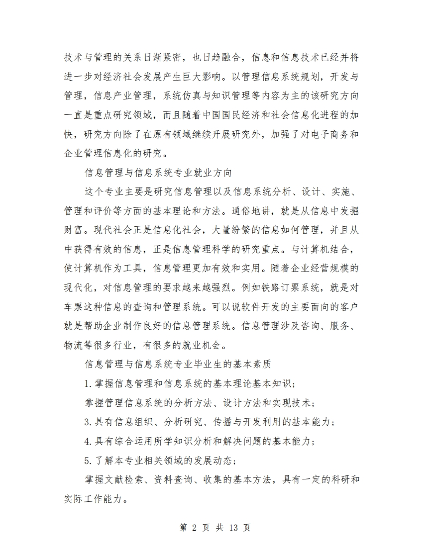 信息管理与信息系统专业大学生职业生涯规划信息管理与信息系统专业大学生职业生涯规划信息管理与信息系统专业培养具备现代管理学理论基础、计算机科学技术知识及应用能力,掌握系统思想和信息系统分析与设计方法以及信息管理等方面的知识与能力,能在国家各级管理部门、工商企业、金融机构、科研单位等部门从事信息管理以及信息系统分析、设计、实施管理和评价等方面的高级专门人才。下面,我CJ为大家整理了信息管理与信息系统专业大学生职业生涯规划,希望你能喜欢!欢迎参考借鉴。信息管理与信息系统专业大学生职业生涯规划信息管理与信息系统专业培养要求本专业学生主要学习管理学、西方经济学、运筹学、管理信息系统、会计学基础、电子商务概论、VCC+语言程序设计、数据库原理、计算机网络、信息系统开发与管理等。信息管理与信息系统专业主要课程管理学,经济学,管理信息系统、信息经济学、信息检索、计算机开发技术,数据库原理与应用、运筹学、应用统计学、组织行为学,信息系统开发项目管理,计算机网络与通信,企业资源计划原理及应用,企业流程改造原理与实务,商法,E即原理与实施,生产与运作管理.市场营销学,财务管理学,人力资源管理,会计学。信息管理与信息系统专业就业前景毕业后可报考信息管理与信息系统专业及相关专业的研究生;国家和省市各级信息产业、财政和金融部随着信息技术的迅猛发展,信息第1页共13页