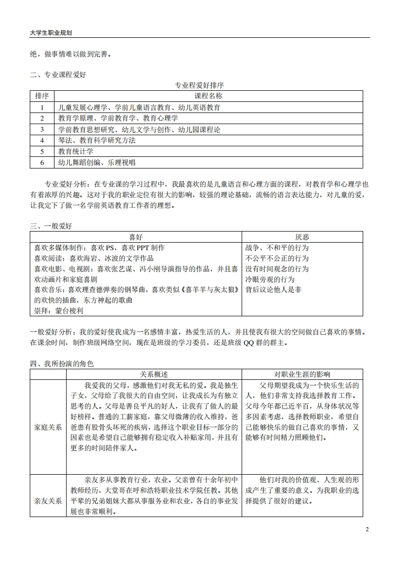 大学生职业规划第一章序言人的一生正如攀登一座山峰,登顶前的每一步都必须脚踏实地。所以,在做职业规划前,我就己经知道以后的路应该怎样走。虽然其中变数很多,但最终的目标是必须有的。当然,做职业规划的同时,也能对自身潜力进行更好的挖掘。首先,我给自己的职业定位为学前教育工作者。这是从自我现状、环境条件、可行性等几个部分开始思考的:结合了一下现实,我更加确定了自己的目标。我的专业是学前教育,第二专业是英语。在四年的专业学习中,我学会了大量的教育学和心理学知识,英语水平也不断提高,这些使我在学前英语教育方面更加优秀。同时,我会比别人更加关注学前儿童的思维与能力,成为孩子成长中的奠基人,在学前儿童成长与学习方面发挥更积极的作用。用更加合理的方法,将英语融入到孩子的世界。此时我是大三的学生,接触孩子的过程,让我更加坚定了自己的理想信念,我非常想走进孩子的世界里,和孩子成为朋友,用英语和他们交谈,给予他们更多的欢乐。尽管现在我的认识还有些局限,但是我拥有一颗理性的头脑。从进大学开始我就有步骤地规划自己的学习和生活。作为一名学前教育专业的学生,在学习自己的本专业的同时,我选择了外国语学院的英语系作为我的第二专业,并且在大一学年通过了粉笔、钢笔和应用文写作测试,在大二学年通过了英语四级的考试,在大三学年通过了普通话等级考试,不断提升自己的教师技能。我本人非常喜爱多媒体课件制作,在寒暑假期间,也到通辽欣网职业学院学习了基础电脑知识、多媒体组装与维修和多媒体课件制作,并且在学校的电脑课上也获得了老师的认可,得到了高分,还通过了国家计算机等级考试。以后在多媒体英语教学方面,我会信心加倍。明确了目标,也剖析了自身的能力,学前儿童英语教育有特定的规律和要求,从教学法的角度来看,教幼儿比教成人更难。孩子在幼儿阶段学习语言是最好的时期,这也正是发挥我实力的时期。实现自己的理想,我会从知识结构上努力。首先,我会用两年的时间准备考取学前教育专业的研究生,考研的目的不仅仅是为了找到一份好工作,更是希望对学前英语教育学有系统的学习和研究。本科毕业后不论是读研还是工作,我都会潜心学习,结合社会实践,计划用三年时间在通辽市区幼儿园做一名幼儿英语老师,将相关的学科知识与对儿童心理学的理解,进行收集汇总。而之后的计划是,在对学前儿童英语教育领域内存在的各种理论和实践问题都有了正确的认识和理解后,我会通过考试的形式,考取通辽职业学校学前教育方面的教师职位,将所拥有的知识、技能、相关的理论传授给其他的学前教育教师。做到从实践到研究再到教学的过程。了解到自己人生的真正追求,我会不断充实自己。根据自己定下的大目标,在追逐理想的同时,不断的认识自身,不断的进行自我调整,争取早日实现自己的人生追求。第二章客观认识自己一、自我情况分析1、自我个性及人格分析性格爽朗、友善,善于与人沟通,开朗乐观:富有爱心,喜欢交朋友,喜欢帮助他人:自由不爱约束:喜欢新鲜事物,敢于冒险:做事细心。缺点是比较不爱运动,有时考虑问题过于乐观。2、优缺点分析:优点缺点(1)具有学前教育专业和英语专业知识,语言表达能力强:(1)不善于拒绝别人的要求:(2)环境适应能力强,做事细心,能够做到随机应变:(2)做事有时缺乏持之以恒,容易三分钟(3)有敬业精神、有热情和责任心:热度:(4)有较强的创新意识、独立思考能力:(3)过于乐观,考虑问题缺乏对消极方面(5)有不错的言语能力和人文素养:的考虑:(6)富有同情心、感恩之心,乐于助人等等。(4)好强、固执。分析:我是属于综合性人才,有能力做多方面的工作,容易上手,可以做到触类旁通:存在的缺点是不善于拒