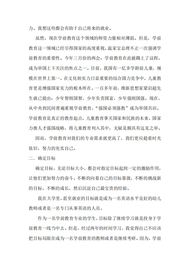 职业生涯规划职业生涯规划的制定,有助于给在校大学生一个明确的就业目标,从而激励他们朝着那个方向不断的努力,奋斗。而且,一份贴合实际又具有一定提升空间的职业生涯规划会给大学生一个可观真实的视角,让大家看到自己的就业前景,慎重择业甚至积极创业,从而提升大学生的就业率,充实大学生的职场生活。这一切都是有利于社会和经济发展的。所以,我们需要为自己制定一份符合自己实际情况的职业生涯规划,也许它不会十分完善规范,但它确是我们在校大学生对职业的理解,对未来就业的憧憬。一,自我认识自我认识,是客观公正地评价自己,使自己对自己的优缺点有一个概念,方便自己确定目标为自己的职业定位,从而较好的帮助自己进步。本人来自教育学院,是09级学前教育专业的大二女生。我的高中阶段是在一所普通高中学习,除了学习,其他技能可谓是一无所有。现在的我若要学习学前教育的相关技能类课程只能说是从零开始。目前,我们的课程已经涉及到有关学前教育专业的技能类课程。但是,在我们所有的课程中,学前教育的理论课程所占的比例还是相当大的,并且技能学习时间相对较少。再加上我本人的动手能力音乐学习能力很差。所以,技能类课程,我掌握的程度不太乐观。因而,救我个人而言,我对自己在学前领域就业的前景甚是担忧。但是,这四年地学习终究会有东西沉淀下来,无论是专业知识还是自己的学习能