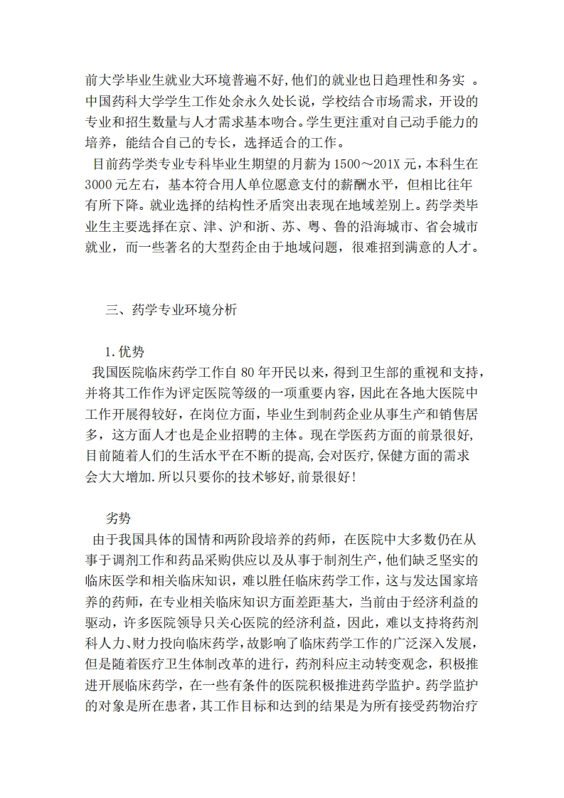 药学专业大学生职业生涯规划范文药学专业大学生职业生涯规划范文鉴于有很多同学对药学专业大学生职业生涯规划很感兴趣,下面我为大家整理了药学专业大学生职业生涯规划范文,希望对你们有帮助!药学专业大学生职业生涯规划范文一本专业培养具备药学学科基本理论、基本知识和实验技能,能在药品生产、检验、流通、使用和研究与开发领域从事鉴定、药物设计、一般药物制剂及临床合理用药等方面工作的高级科学技术人才。那么,药学专业大学生职业生涯规划书怎么写呢?下面让职导网我通过案例传授各位看官一点大学生个人职业生涯规划书制作技巧吧!一、药学专业环境及评价药学专业的就业方向十分广阔,与药品相关的各个领域都需要药学专业的毕业生。具体而言有医院、科研院所、药厂、医药药学专业的就业方向十分广阔,与药品相关的各个领域都需要药学专业的毕业生。具体而言有医院、科研院所、药厂、医药公司、国家药品管理机关等单位。药学专业学生毕业后可从事一切与药物有关的工作:科研人员在研究所、药厂的研究部门,从事药物的研发工作:医院药剂师在医院药剂科,从事制剂、质检、临床药学等工作;药检人员在药检所从事药物的质量鉴定和制定相应的质量标准:公司职员在医药贸易公司或制药企业从事药品生产、流通及国内外贸易公司、国家药品管理机关二、药学专业的现状及前景据了解,药学毕业生在选择工作时主要考虑单位的发展方向和知名度、是否能给自己提供充足的发展空间、工作地点和薪酬水平。目