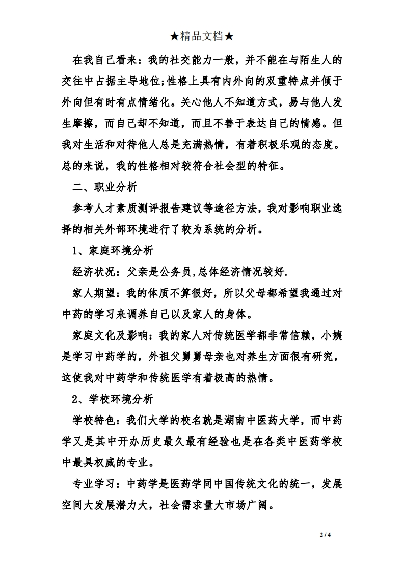 ★精品文档★医学专业大学生职业生涯规划书转眼之间大一第一个学期只剩下短短的半个月,如今知识经济迅猛增长源源不断,人才竞争日趋激烈,我不由考虑起自己的前程:在机遇与挑战面前,作为一个学习医学的大学生,我将如何面对?俗话说,欲行千里,先立其志。因此,我首先要把自已今后学习生活以及工作目标大致计划一下,让多一份力量鞭策我、激励我在未知多变的人生旅途中稳健前行。一、自我分析专业概况:预防医学的课程主要有基础医学、临床医学的专业课,自己的专业课有:统计学、卫生毒理学、流行病学、职业卫生与职业医学、环境卫生学、食品营养与卫生学。结合人才测评报告等分析方法,我对自己进行了全方位、多角度的的分析。我的人才素质测评报告中,职业兴趣前四项是社会型(8分)、企业型、现实型、研究型(7分)。报告分析显示,社会型的人喜爱训练人、治疗、教育人的活动。他们具有教育能力和善于与人相处等人际关系方面的能力,这种类型的人适合于做教员、咨询、社会工作者等以与人接触为中心的社会服务性工作,其人格特征是社交的、爱帮助人和善解人意的。1/4