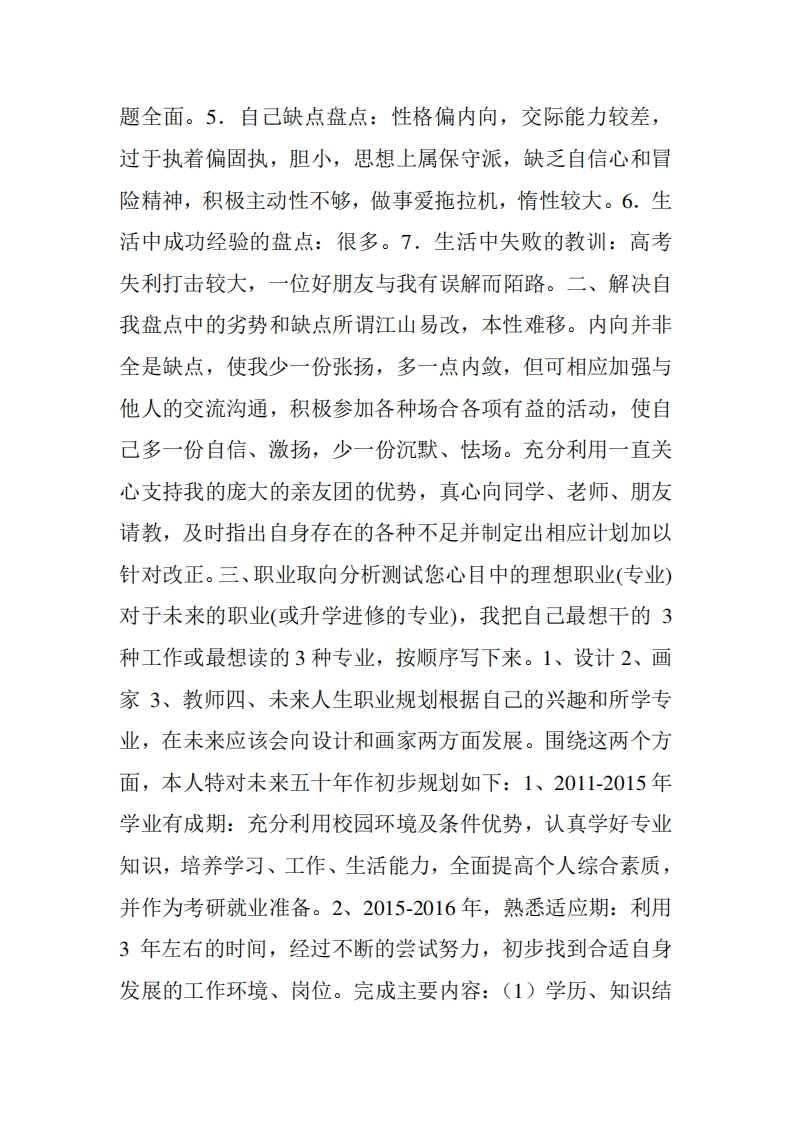 艺术类大学生职业生涯规划书(共4篇)艺术类大学生职业生涯规划书一、自我盘点1.自己兴趣爱好大盘点:画画、业余爱好读书、听音乐、电脑知识;喜欢的文学作品《红楼梦》、《战争与和平》、《老人与海》、《平凡的世界》;喜欢的歌曲《Brothers)》、《听海》、《流年》:心中偶像自己2.自己优势盘点:素描造型能力较好。3.自己劣势盘点:注意力分散。4.自己的优点盘点:做事仔细认真、踏实,友善待人,做事锲而不舍,勤于思考,考虑问