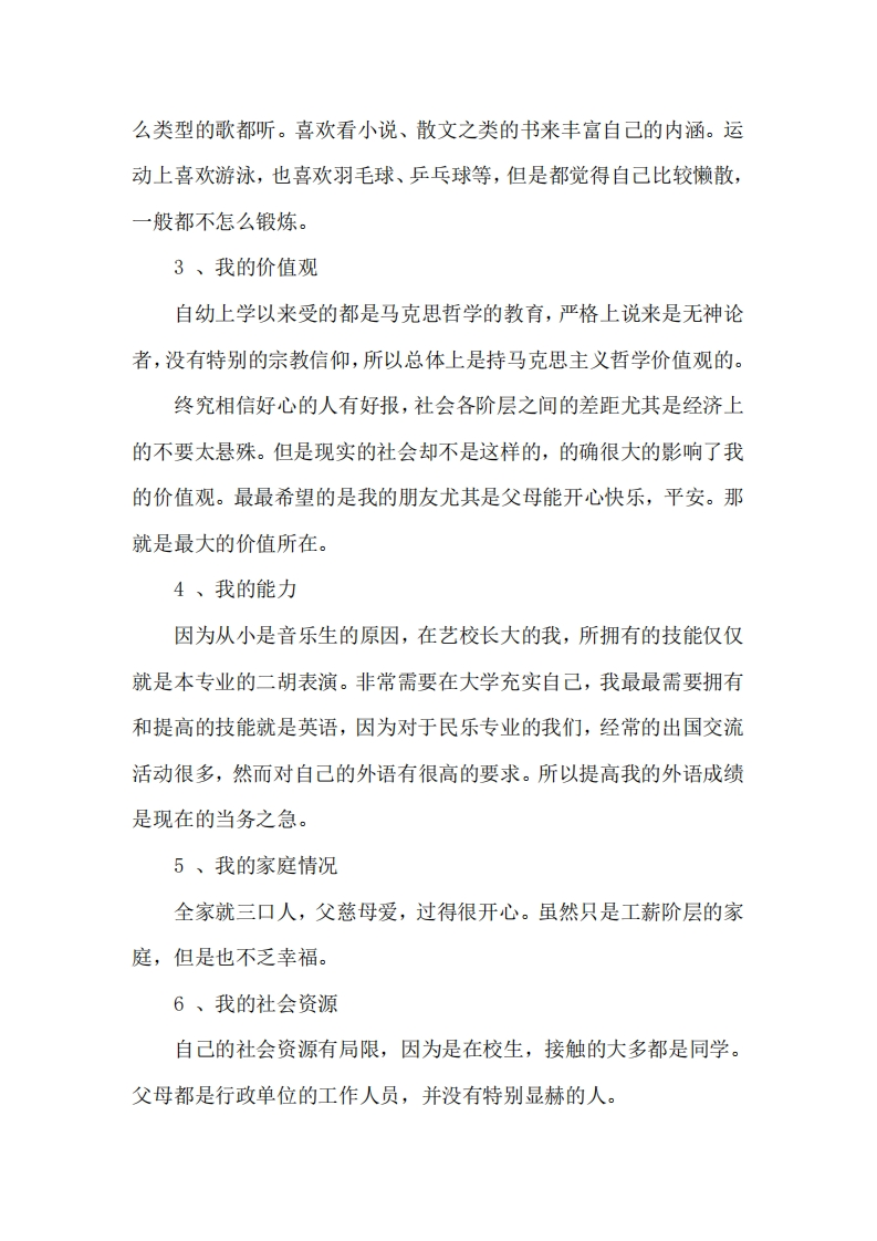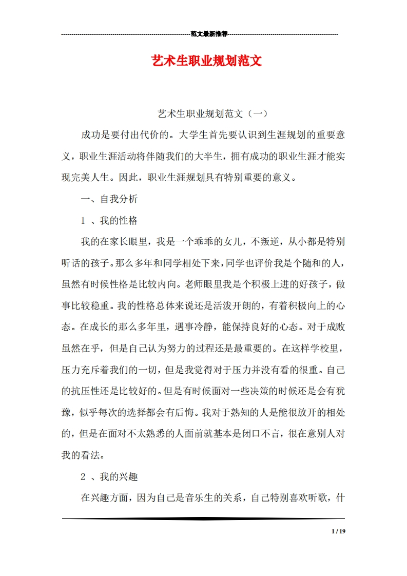 范文最新推荐艺术生职业规划范文艺术生职业规划范文(一)成功是要付出代价的。大学生首先要认识到生涯规划的重要意义,职业生涯活动将伴随我们的大半生,拥有成功的职业生涯才能实现完美人生。因此,职业生涯规划具有特别重要的意义。一、自我分析1、我的性格我的在家长眼里,我是一个乖乖的女儿,不叛逆,从小都是特别听话的孩子。那么多年和同学相处下来,同学也评价我是个随和的人,虽然有时候性格是比较内向。老师眼里我是个积极上进的好孩子,做事比较稳重。我的性格总体来说还是活泼开朗的,有着积极向上的心态。在成长的那么多年里,遇事冷静,能保持良好的心态。对于成败虽然在乎,但是自己认为努力的过程还是最重要的。在这样学校里,压力充斥着我们的一切,但是我觉得对于压力并没有看的很重。自己的抗压性还是比较好的。但是有时候面对一些决策的时候还是会有犹豫,似乎每次的选择都会有后悔。我对于熟知的人是能很放开的相处的,但是在面对不太熟悉的人面前就基本是闭口不言,很在意别人对我的看法。2、我的兴趣在兴趣方面,因为自己是音乐生的关系,自己特别喜欢听歌,什1/19