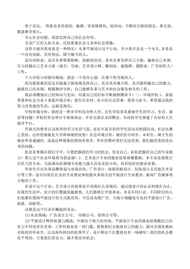 艺术专业大学生职业生涯规划书一、引言不管是何时,每个人都憧憬着美好的未来,每个人都希望拥有舒适幸福的生活。而当下更是一个竞争微烈并更加现实的时代。将要面对的是许许多多的事与物,挑战与挫折将不断地冲撞自己的理想。在今天这个人才竞争的时代,职业生涯规划开始成为就业的有力武器。对于每一个人而言,职业生命是有限的,如果不进行有效的规划,势必会造成时间和精力的浪费。作为当代的大学生,若是一脸茫然踏入这个竞争激烈的社会,将会使自己更加被动。职业生涯不是几年的功夫,而是几十年的光景,必须面对时代的变迁,在时间的面前谁都是个孩子。艺术设计专业大学生更是要做好自己的职业生涯规划才能有出路。有一份职业生涯规划,对人生有莫大的帮助,毕竞把人生掌握在自己手里比随遇而安好的多。作为名在小大学生,我必须对自己的职业有所规划,这样才不会使自己在以后应聘时茫然无措。从现在开始我将为未来的挑战准备,制定一份职业生涯的规划书,向黑夜出发去迎接黎明,向未知前进去捕获希望。!二、自我评估3个人自身分析:【1】个人性格分析:性格开朗活泼,熟人在一起就会非常活跃,但和陌人在一起就会很安静:说话不够稳重,思想单纯,不够成熟!解决:多长见识,多听讲座,改变自己的怕生的缺点。任何事情的开始:态度是关键!只要自己端正态度,努力学习,一定可以变的更加自信。【2】个人时间分析:日常生活中,对自己的事情没有一个确定的时间安排,睡眠及学习时间混淆,时间意志力不强!每天大部分时间都在做无用功!解决:确定每天要做的事情,严格要求自己珍惜每一分每一秒,确定自己的时间观念。学会每天总结,反省自己每天做事情浪费了多少时间。【3】浮躁:一个人能否实现目标,能否实现理想:关键在于对事情是否有一个冷静的头脑:以及是否拥有一个执着的心思坚持下去!解决:戒骄戒糙:不断的自我审视,自我检讨,承认错误面准目标坚持下去!【4】我的职业爱好:喜欢绘画、听音乐、看电影、逛设计网站。【5】我的职业能力:对自己喜爱的东西会坚持不懈努力做到最好!我的优势与劣势4他人评估5测评结果(1)霍兰德职业倾向测验量法霍兰德职业倾向测验量法测评,我进一步客观地认识自己,发现其中的测评结果与上述的评估基本吻合的:属于艺术型和社会型。(2)职业兴趣测评分析分析表明:我的职业兴趣类型为:社会艺术型。表现在有创造力,乐于创造新颗、与众不同的成果,渴望表现自己的个性,实现自身的价值。具有一定的艺术才能和个性。